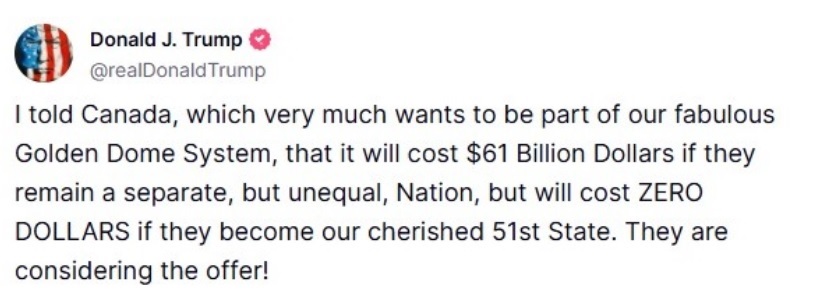 ਟਰੰਪ ਨੇ ਅਮਰੀਕਾ ਦੇ ਉੱਤਰੀ ਗੁਆਂਢੀ ਨੂੰ 51ਵਾਂ ਰਾਜ ਬਣਨ ਲਈ ਵਾਰ-ਵਾਰ ਪ੍ਰਸਤਾਵ ਦਿੱਤਾ ਹੈ। ਕੈਨੇਡਾ ਨੇ ਵੀ ਮਿਜ਼ਾਈਲ ਪ੍ਰਣਾਲੀ ਵਿੱਚ ਸ਼ਾਮਲ ਹੋਣ ਵਿੱਚ ਦਿਲਚਸਪੀ ਦਿਖਾਈ ਹੈ। 'ਗੋਲਡਨ ਡੋਮ' ਦਾ ਐਲਾਨ ਟਰੰਪ ਦੁਆਰਾ ਪਿਛਲੇ ਹਫ਼ਤੇ ਹੀ ਕੀਤਾ ਗਿਆ ਸੀ। ਇਸ ਦੌਰਾਨ ਟਰੰਪ ਨੇ ਕਈ ਹਥਿਆਰਾਂ ਦਾ ਵੀ ਜ਼ਿਕਰ ਕੀਤਾ, ਜੋ ਲੋਕਾਂ ਅਤੇ ਦੇਸ਼ ਨੂੰ ਦੁਸ਼ਮਣ ਹਥਿਆਰਾਂ ਤੋਂ ਬਚਾ ਸਕਦੇ ਹਨ। ਟਰੰਪ ਨੇ ਆਪਣੇ ਟਰੂੱਥ ਸੋਸ਼ਲ ਨੈੱਟਵਰਕ 'ਤੇ ਪੋਸਟ ਕੀਤਾ, 'ਮੈਂ ਕੈਨੇਡਾ ਨੂੰ ਕਿਹਾ ਸੀ ਕਿ ਜੋ ਵੀ ਸਾਡੇ ਸ਼ਾਨਦਾਰ ਗੋਲਡਨ ਡੋਮ ਪ੍ਰਣਾਲੀ ਦਾ ਹਿੱਸਾ ਬਣਨਾ ਚਾਹੁੰਦਾ ਹੈ, ਉਸਨੂੰ ਸਾਡੀ ਗੱਲ ਸੁਣਨੀ ਪਵੇਗੀ। ਜੇਕਰ ਉਹ ਇੱਕ ਵੱਖਰਾ ਰਾਸ਼ਟਰ ਬਣਿਆ ਰਹਿੰਦਾ ਹੈ, ਤਾਂ ਉਸਨੂੰ 61 ਬਿਲੀਅਨ ਡਾਲਰ ਖਰਚ ਕਰਨੇ ਪੈਣਗੇ। ਜੇਕਰ ਉਹ ਸਾਡਾ ਪਿਆਰਾ 51ਵਾਂ ਰਾਜ ਬਣ ਜਾਂਦਾ ਹੈ, ਤਾਂ ਇਸਦੀ ਕੀਮਤ ਉਨ੍ਹਾਂ ਨੂੰ ਜ਼ੀਰੋ ਡਾਲਰ ਹੋਵੇਗੀ। ਉਹ ਇਸ ਪੇਸ਼ਕਸ਼ 'ਤੇ ਵਿਚਾਰ ਕਰ ਰਹੇ ਹਨ!' ਟਰੰਪ ਦੀ ਇਸ ਯੋਜਨਾ ਦੀ ਅਨੁਮਾਨਤ ਲਾਗਤ ਲਗਭਗ 175 ਬਿਲੀਅਨ ਡਾਲਰ ਹੈ।