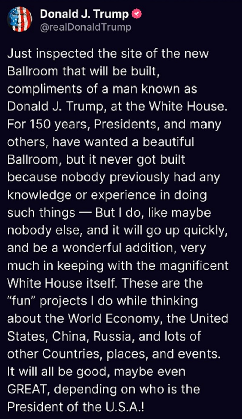 ਟਰੰਪ ਨੇ ਬਾਲਰੂਮ ਬਾਰੇ ਕਿਹਾ,"ਪਰ ਮੈਂ ਅਜਿਹਾ ਕਰਨ ਜਾ ਰਿਹਾ ਹਾਂ, ਸ਼ਾਇਦ ਕਿਸੇ ਹੋਰ ਵਾਂਗ ਨਹੀਂ ਅਤੇ ਇਹ ਤੇਜ਼ੀ ਨਾਲ ਬਣੇਗਾ ਅਤੇ ਸ਼ਾਨਦਾਰ ਨਿਰਮਾਣ ਹੋਵੇਗਾ ਜੋ ਕਿ ਵ੍ਹਾਈਟ ਹਾਊਸ ਦੇ ਅੰਦਰ ਇੱਕ ਸ਼ਾਨਦਾਰ ਮਾਹੌਲ ਬਣਾਏਗਾ"। ਟਰੰਪ ਮੁਤਾਬਕ,"ਇਹ ਉਹ 'ਮਜ਼ੇਦਾਰ' ਪ੍ਰੋਜੈਕਟ ਹਨ ਜੋ ਮੈਂ ਵਿਸ਼ਵ ਅਰਥਵਿਵਸਥਾ ਸੰਯੁਕਤ ਰਾਜ, ਚੀਨ, ਰੂਸ ਅਤੇ ਹੋਰ ਬਹੁਤ ਸਾਰੇ ਦੇਸ਼ਾਂ, ਥਾਵਾਂ ਅਤੇ ਸਮਾਗਮਾਂ ਬਾਰੇ ਸੋਚਦੇ ਹੋਏ ਕਰਦਾ ਹਾਂ।"