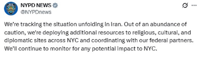 ਨਿਊਯਾਰਕ ਪੁਲਸ ਵਿਭਾਗ (NYPD) ਨੇ ਪੂਰੇ ਸ਼ਹਿਰ ਵਿੱਚ ਧਾਰਮਿਕ, ਸੱਭਿਆਚਾਰਕ ਅਤੇ ਕੂਟਨੀਤਕ ਸਥਾਨਾਂ 'ਤੇ ਤਾਇਨਾਤੀਆਂ ਵਧਾਉਣ ਦਾ ਐਲਾਨ ਕੀਤਾ ਹੈ। ਵਿਭਾਗ ਨੇ X 'ਤੇ ਇੱਕ ਪੋਸਟ ਵਿੱਚ ਕਿਹਾ,"ਅਸੀਂ ਈਰਾਨ ਵਿੱਚ ਪੈਦਾ ਹੋ ਰਹੀ ਸਥਿਤੀ 'ਤੇ ਨਜ਼ਰ ਰੱਖ ਰਹੇ ਹਾਂ।" ਪੋਸਟ ਮੁਤਾਬਕ," ਸਾਵਧਾਨੀ ਤਹਿਤ ਅਸੀਂ NYC ਭਰ ਵਿੱਚ ਧਾਰਮਿਕ, ਸੱਭਿਆਚਾਰਕ ਅਤੇ ਕੂਟਨੀਤਕ ਸਥਾਨਾਂ 'ਤੇ ਵਾਧੂ ਸਰੋਤ ਤਾਇਨਾਤ ਕਰ ਰਹੇ ਹਾਂ ਅਤੇ ਆਪਣੇ ਸੰਘੀ ਭਾਈਵਾਲਾਂ ਨਾਲ ਤਾਲਮੇਲ ਕਰ ਰਹੇ ਹਾਂ। ਅਸੀਂ NYC 'ਤੇ ਕਿਸੇ ਵੀ ਸੰਭਾਵੀ ਪ੍ਰਭਾਵ ਦੀ ਨਿਗਰਾਨੀ ਕਰਨਾ ਜਾਰੀ ਰੱਖਾਂਗੇ।"