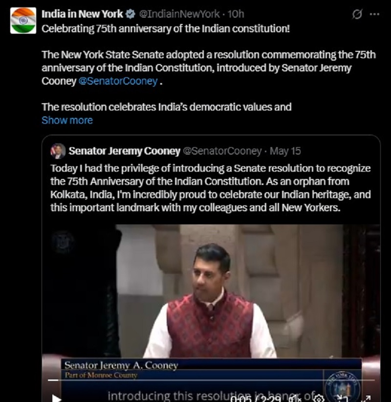 ਨਿਊਯਾਰਕ ਵਿੱਚ ਭਾਰਤ ਦੇ ਕੌਂਸਲੇਟ ਜਨਰਲ ਨੇ 'X' 'ਤੇ ਇੱਕ ਪੋਸਟ ਵਿੱਚ ਕਿਹਾ, "ਭਾਰਤੀ ਸੰਵਿਧਾਨ ਦੀ 75ਵੀਂ ਵਰ੍ਹੇਗੰਢ ਮਨਾ ਰਹੇ ਹਾਂ! ਨਿਊਯਾਰਕ ਸਟੇਟ ਸੈਨੇਟ ਨੇ ਸੈਨੇਟਰ ਜੇਰੇਮੀ ਕੂਨੀ ਦੁਆਰਾ ਭਾਰਤੀ ਸੰਵਿਧਾਨ ਦੀ 75ਵੀਂ ਵਰ੍ਹੇਗੰਢ ਦੀ ਯਾਦ ਵਿੱਚ ਪੇਸ਼ ਕੀਤੇ ਗਏ ਇੱਕ ਮਤੇ ਨੂੰ ਅਪਣਾਇਆ। "ਇਹ ਮਤਾ ਭਾਰਤ ਦੇ ਲੋਕਤੰਤਰੀ ਮੁੱਲਾਂ ਅਤੇ ਆਜ਼ਾਦੀ, ਨਿਆਂ ਅਤੇ ਸਮਾਨਤਾ ਪ੍ਰਤੀ ਸੰਯੁਕਤ ਰਾਜ ਅਮਰੀਕਾ ਨਾਲ ਇਸਦੀ ਸਾਂਝੀ ਵਚਨਬੱਧਤਾ ਦਾ ਜਸ਼ਨ ਮਨਾਉਂਦਾ ਹੈ," ਇਸ ਵਿੱਚ ਕਿਹਾ ਗਿਆ ਹੈ। ਬਿਨੈ ਸ਼੍ਰੀਕਾਂਤ ਨੇ ਭਾਰਤੀ-ਅਮਰੀਕੀ ਭਾਈਚਾਰੇ ਦੇ ਮੈਂਬਰਾਂ ਨਾਲ ਸਮਾਰੋਹ ਵਿੱਚ ਸ਼ਿਰਕਤ ਕੀਤੀ। ਇਹ ਸਾਂਝੇ ਲੋਕਤੰਤਰੀ ਆਦਰਸ਼ਾਂ ਅਤੇ ਸੱਭਿਆਚਾਰਕ ਸਬੰਧਾਂ ਦਾ ਜਸ਼ਨ ਸੀ।''