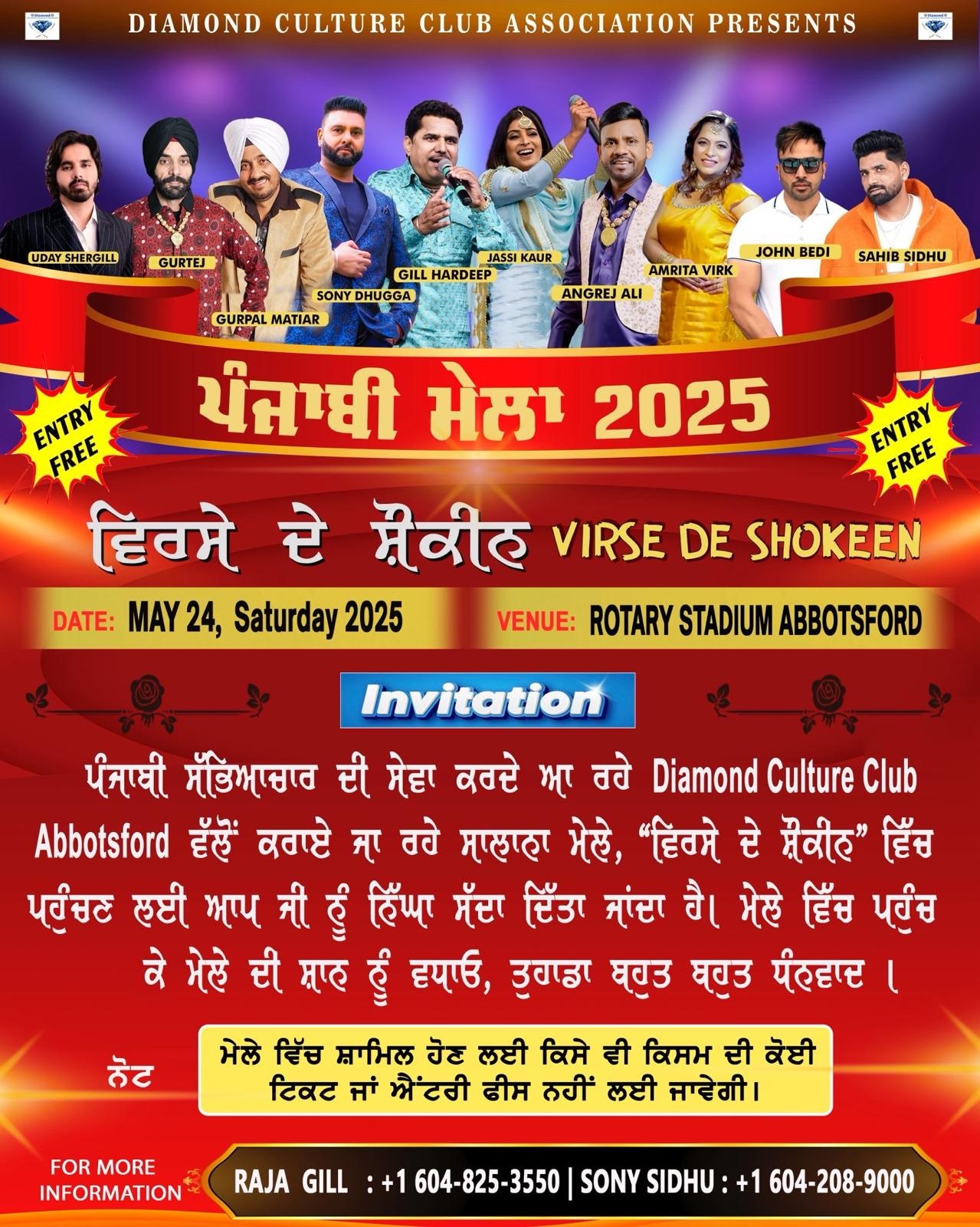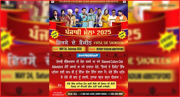 ਵੈਨਕੂਵਰ (ਮਲਕੀਤ ਸਿੰਘ)- ਡਾਇਮੰਡ ਸੱਭਿਆਚਾਰਕ ਕਲੱਬ ਵੱਲੋਂ ਸਥਾਨਕ ਪੰਜਾਬੀ ਭਾਈਚਾਰੇ ਦੇ ਸਹਿਯੋਗ ਨਾਲ 24 ਮਈ ਦਿਨ ਸ਼ਨੀਵਾਰ ਨੂੰ ਐਬਟਸਫੋਰਡ ਸਥਿਤ ਰੋਟਰੀ ਸਟੇਡੀਅਮ 'ਚ “ਵਿਰਸੇ ਦੇ ਸ਼ੌਕੀਨ” ਪੰਜਾਬੀ ਮੇਲਾ ਕਰਵਾਇਆ ਜਾ ਰਿਹਾ ਹੈ।