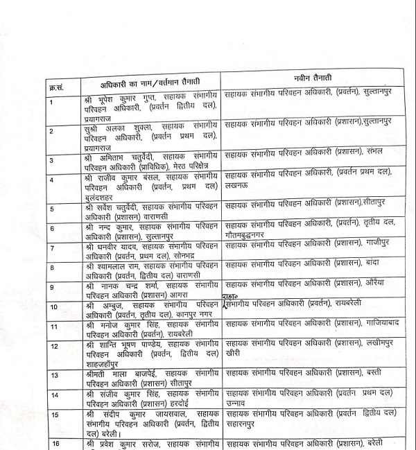 ਨਵੀਂ ਤਾਇਨਾਤੀਆਂ ਦੇ ਅਨੁਸਾਰ ਪ੍ਰਭਾਤ ਪਾਂਡੇ ਲਖਨਉ ਦੇ ਨਵੇਂ RTO (ਇਨਫੋਰਸਮੈਂਟ) ਨਿਯੁਕਤ ਹੋਏ ਹਨ। ਪ੍ਰਣਵ ਝਾ ਨੂੰ ਬਰੇਲੀ, ਰਾਜੇਸ਼ ਮੌਰਿਆ ਨੂੰ ਗੋਂਡਾ, ਅਨੀਤਾ ਸਿੰਘ ਨੂੰ ਮੇਰਠ ਤੇ ਹਿਮੇਸ਼ ਤਿਵਾਰੀ ਨੂੰ ਪ੍ਰਯਾਗਰਾਜ ਦਾ RTO ਨਿਯੁਕਤ ਕੀਤਾ ਗਿਆ ਹੈ। ਇਸ ਫੈਸਲੇ ਨਾਲ ਉਮੀਦ ਕੀਤੀ ਜਾ ਰਹੀ ਹੈ ਕਿ ਵਿਭਾਗ ਦੀ ਕਾਰਗੁਜ਼ਾਰੀ ਵਿੱਚ ਸੁਧਾਰ ਆਵੇਗਾ ਤੇ ਨਵੇਂ ਅਧਿਕਾਰੀ ਲੋਕਾਂ ਦੀਆਂ ਸਮੱਸਿਆਵਾਂ ਨੂੰ ਪ੍ਰਭਾਵਸ਼ਾਲੀ ਢੰਗ ਨਾਲ ਸੁਣਨ ਅਤੇ ਹੱਲ ਕਰਨ ਵਿੱਚ ਯੋਗਦਾਨ ਪਾਵਣਗੇ।