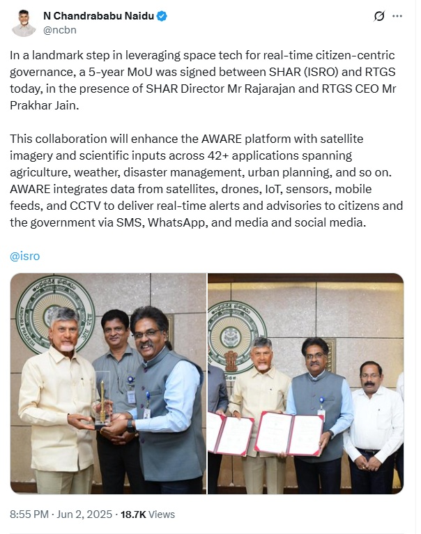 ਨਾਇਡੂ ਨੇ 'ਐਕਸ' 'ਤੇ ਇਕ ਪੋਸਟ 'ਚ ਕਿਹਾ,''ਅਸਲ ਸਮੇਂ 'ਚ ਨਾਗਰਿਕ ਕੇਂਦ੍ਰਿਤ ਸ਼ਾਸਨ ਲਈ ਪੁਲਾੜ ਤਕਨੀਕ ਦਾ ਲਾਭ ਚੁੱਕਣ 'ਚ ਇਕ ਇਤਿਹਾਸਕ ਕਦਮ ਦੇ ਅਧੀਨ, ਅੱਜ ਐੱਸਐੱਚਏਆਰ (ਇਸਰੋ) ਅਤੇ ਆਰਜੀਟੀਐੱਸ ਵਿਚਾਲੇ 5 ਸਾਲ ਲਈ ਸਮਝੌਤਾ (ਐੱਮਓਯੂ) ਹੋਇਆ। ਇਸ ਦੌਰਾਨ ਐੱਸਐੱਚਏਆਰ ਦੇ ਡਾਇਰੈਕਟਰ ਸ਼੍ਰੀ ਰਾਜਰਾਜਨ ਮੌਜੂਦ ਸਨ।'' ਇਸ ਸਹਿਯੋਗ ਦੇ ਅਧੀਨ ਸੈਟੇਲਾਈਟ ਚਿੱਤਰਾਂ ਅਤੇ ਵਿਗਿਆਨਕ ਜਾਣਕਾਰੀਆਂ ਨੂੰ ਏਡਬਲਿਊਏਆਰਈ ਮੰਚ 'ਚ ਖੇਤੀਬਾੜੀ, ਮੌਸਮ, ਆਫ਼ਤ ਪ੍ਰਬੰਧਨ, ਸ਼ਹਿਰੀ ਯੋਜਨਾਬੰਦੀ ਆਦਿ ਨਾਲ ਸੰਬੰਧਤ 42 ਐਪਲੀਕੇਸ਼ਨਾਂ 'ਚ ਸ਼ਾਮਲ ਕੀਤਾ ਜਾਵੇਗਾ।
