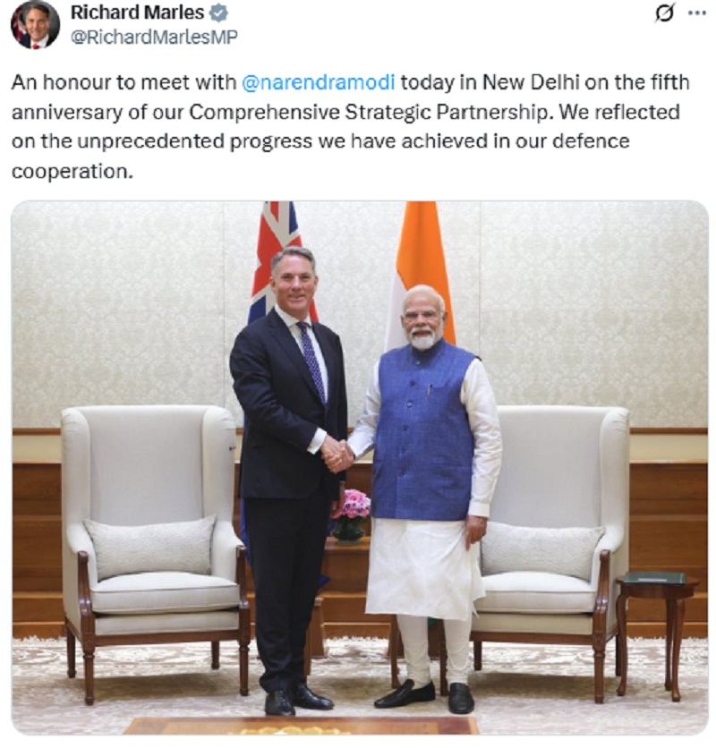 ਨਵੀਂ ਦਿੱਲੀ- ਆਸਟ੍ਰੇਲੀਆ ਦੇ ਉਪ ਪ੍ਰਧਾਨ ਮੰਤਰੀ ਅਤੇ ਰੱਖਿਆ ਮੰਤਰੀ ਰਿਚਰਡ ਮਾਰਲਸ ਨੇ ਪਿਛਲੇ ਮਹੀਨੇ ਚਾਰ ਦਿਨਾਂ ਦੇ ਫੌਜੀ ਟਕਰਾਅ ਤੋਂ ਬਾਅਦ ਪਾਕਿਸਤਾਨ ਨਾਲ ਜੰਗਬੰਦੀ 'ਤੇ ਪਹੁੰਚਣ ਦੇ "ਸਖਤ ਫੈਸਲੇ" ਲਈ ਭਾਰਤ ਦੀ ਪ੍ਰਸ਼ੰਸਾ ਕੀਤੀ ਹੈ ਅਤੇ ਇਸਨੂੰ "ਭਾਰਤੀ ਲੀਡਰਸ਼ਿਪ ਦਾ ਕੰਮ" ਦੱਸਿਆ ਹੈ। ਮੀਡੀਆ ਨਾਲ ਗੱਲ ਕਰਦੇ ਹੋਏ ਮਾਰਲਸ ਨੇ 22 ਅਪ੍ਰੈਲ ਨੂੰ ਪਹਿਲਗਾਮ ਵਿੱਚ ਹੋਏ ਹਮਲੇ ਨੂੰ "ਭਿਆਨਕ" ਦੱਸਿਆ ਅਤੇ ਕਿਹਾ ਕਿ ਪ੍ਰਧਾਨ ਮੰਤਰੀ ਅਲਬਾਨੀਜ਼ ਪਹਿਲੇ ਵਿਸ਼ਵ ਨੇਤਾਵਾਂ ਵਿੱਚੋਂ ਇੱਕ ਸਨ, ਜਿਨ੍ਹਾਂ ਨੇ ਖ਼ਬਰਾਂ ਆਉਣ ਤੋਂ ਬਾਅਦ ਪ੍ਰਧਾਨ ਮੰਤਰੀ ਨਰਿੰਦਰ ਮੋਦੀ ਨਾਲ ਗੱਲ ਕੀਤੀ। ਅੱਤਵਾਦੀ ਹਮਲੇ ਪ੍ਰਤੀ ਭਾਰਤ ਦੇ ਜਵਾਬ ਬਾਰੇ ਪੁੱਛੇ ਜਾਣ 'ਤੇ ਉਨ੍ਹਾਂ ਨੇ ਕਿਹਾ,"ਸਭ ਤੋਂ ਪਹਿਲਾਂ ਅਸੀਂ ਪਹਿਲਗਾਮ ਵਿੱਚ ਜੋ ਹੋਇਆ ਉਸ ਦੀ ਖ਼ਬਰ ਸੁਣ ਕੇ ਬਹੁਤ ਹੈਰਾਨ ਹੋਏ"।