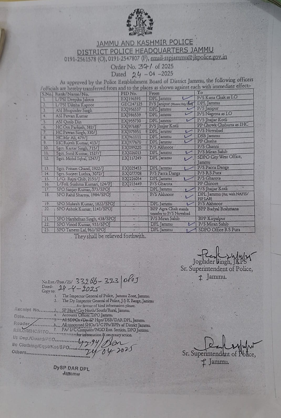 ਜੰਮੂ ਡੈਸਕ: ਜੰਮੂ ਜ਼ਿਲ੍ਹੇ ਦੇ ਪੁਲਿਸ ਹੈੱਡਕੁਆਰਟਰ ਨੇ ਇੱਕ ਆਦੇਸ਼ ਜਾਰੀ ਕੀਤਾ ਹੈ, ਜਿਸ ਵਿੱਚ ਵੱਖ-ਵੱਖ ਪੁਲਿਸ ਅਧਿਕਾਰੀਆਂ ਅਤੇ ਕਰਮਚਾਰੀਆਂ ਦੇ ਤਬਾਦਲਿਆਂ ਦਾ ਐਲਾਨ ਕੀਤਾ ਗਿਆ ਹੈ। ਇਸ ਆਦੇਸ਼ ਨੂੰ ਪੁਲਿਸ ਸਥਾਪਨਾ ਬੋਰਡ ਨੇ ਮਨਜ਼ੂਰੀ ਦੇ ਦਿੱਤੀ ਹੈ ਅਤੇ ਇਸਨੂੰ ਤੁਰੰਤ ਪ੍ਰਭਾਵ ਨਾਲ ਲਾਗੂ ਕਰ ਦਿੱਤਾ ਗਿਆ ਹੈ। ਤਬਾਦਲਿਆਂ ਦੀ ਸੂਚੀ ਵਿੱਚ ਬਹੁਤ ਸਾਰੇ ਪੁਲਿਸ ਅਧਿਕਾਰੀਆਂ ਅਤੇ ਕਰਮਚਾਰੀਆਂ ਨੂੰ ਇੱਕ ਜਗ੍ਹਾ ਤੋਂ ਦੂਜੀ ਜਗ੍ਹਾ ਤਬਦੀਲ ਕੀਤਾ ਗਿਆ ਹੈ। ਪਹਿਲਗਾਮ ਹਮਲੇ ਤੋਂ ਬਾਅਦ ਪ੍ਰਸ਼ਾਸਨ ਵੱਲੋਂ ਇਹ ਕਦਮ ਚੁੱਕਿਆ ਗਿਆ ਹੈ। ਜਿਸ ਕਾਰਨ ਜੰਮੂ ਪੁਲਿਸ ਵੱਲੋਂ ਇਹ ਸੂਚੀ ਜਾਰੀ ਕੀਤੀ ਗਈ ਹੈ।