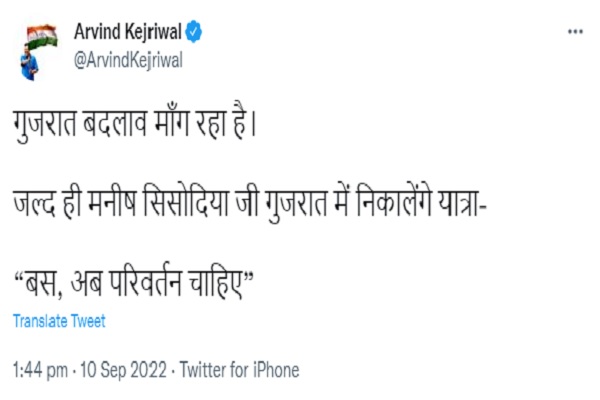 ਨਵੀਂ ਦਿੱਲੀ (ਭਾਸ਼ਾ)- ਦਿੱਲੀ ਦੇ ਮੁੱਖ ਮੰਤਰੀ ਅਰਵਿੰਦ ਕੇਜਰੀਵਾਲ ਨੇ ਸ਼ਨੀਵਾਰ ਨੂੰ ਕਿਹਾ ਕਿ ਗੁਜਰਾਤ ਤਬਦੀਲੀ ਮੰਗ ਕਰ ਰਿਹਾ ਹੈ ਅਤੇ ਆਮ ਆਦਮੀ ਪਾਰਟੀ (ਆਪ) ਦੇ ਸੀਨੀਅਰ ਨੇਤਾ ਮਨੀਸ਼ ਸਿਸੋਦੀਆ ਜਲਦ ਹੀ ਭਾਜਪਾ ਸ਼ਾਸਿਤ ਸੂਬੇ 'ਚ ਲੋਕਾਂ ਦੀਆਂ ਮੰਗਾਂ ਨੂੰ ਪੂਰਾ ਕਰਨ ਲਈ ਮਾਰਚ ਕੱਢਣਗੇ। ਹਾਲਾਂਕਿ, 'ਆਪ' ਦੇ ਰਾਸ਼ਟਰੀ ਕਨਵੀਨਰ ਨੇ ਆਪਣੇ ਟਵਿੱਟਰ ਪੋਸਟ ਵਿਚ ਇਹ ਗੱਲ ਦਾ ਜ਼ਿਕਰ ਨਹੀਂ ਕੀਤਾ ਕਿ ਸਿਸੋਦੀਆ ਗੁਜਰਾਤ ਵਿਚ ਤਬਦੀਲੀ ਲਈ ਆਪਣੀ ਪਾਰਟੀ ਦਾ ਮਾਰਚ ਕੱਢਣ ਲਈ ਉਥੇ ਕਦੋਂ ਜਾਣਗੇ। ਇਕ ਟਵੀਟ ਵਿੱਚ ਕੇਜਰੀਵਾਲ ਨੇ ਕਿਹਾ,"ਗੁਜਰਾਤ ਤਬਦੀਲੀ ਮੰਗ ਰਿਹਾ ਹੈ। ਜਲਦ ਹੀ ਮਨੀਸ਼ ਸਿਸੋਦੀਆ ਜੀ ਗੁਜਰਾਤ 'ਚ ਯਾਤਰਾ ਕੱਢਣਗੇ।" ਉਨ੍ਹਾਂ ਕਿਹਾ,''ਬੱਸ ਹੁਣ ਤਬਦੀਲੀ ਚਾਹੀਦੀ ਹੈ।''