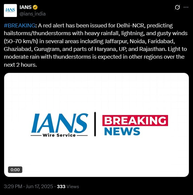 ਹੁਣ ਮੌਸਮ ਵਿਭਾਗ ਨੇ ਦਿੱਲੀ-ਐੱਨ.ਸੀ.ਆਰ. ਲਈ ਭਾਰੀ ਬਾਰਿਸ਼, ਅਸਮਾਨੀ ਬਿਜਲੀ ਤੇ ਹਨੇਰੀ-ਤੂਫ਼ਾਨ ਦਾ ਰੈੱਡ ਅਲਰਟ ਜਾਰੀ ਕੀਤਾ ਹੈ। ਇਸ ਤੋਂ ਇਲਾਵਾ ਜਾਫ਼ਰਪੁਰ, ਨੋਇਡਾ, ਫਰੀਦਾਬਾਦ, ਗਾਜ਼ੀਆਬਾਦ, ਗੁਰੂਗ੍ਰਾਮ ਤੋਂ ਇਲਾਵਾ ਹਰਿਆਣਾ, ਉੱਤਰ ਪ੍ਰਦੇਸ਼ ਤੇ ਰਾਜਸਥਾਨ ਦੇ ਕੁਝ ਇਲਾਕਿਆਂ 'ਚ ਵੀ 50-70 ਕਿੱਲੋਮੀਟਰ ਪ੍ਰਤੀ ਘੰਟੇ ਦੀ ਰਫ਼ਤਾਰ ਨਾਲ ਤੇਜ਼ ਹਵਾਵਾਂ ਚੱਲਣ ਦੀ ਚਿਤਾਵਨੀ ਜਾਰੀ ਕੀਤੀ ਹੈ।