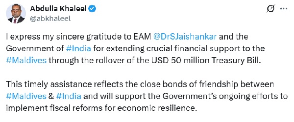 ਭਾਰਤ ਨੇ 50 ਮਿਲੀਅਨ ਡਾਲਰ ਦੇ ਖਜ਼ਾਨਾ ਬਿੱਲਾਂ ਦੇ ਰੋਲਓਵਰ ਰਾਹੀਂ ਮਾਲਦੀਵ ਨੂੰ ਵਿੱਤੀ ਸਹਾਇਤਾ ਪ੍ਰਦਾਨ ਕੀਤੀ ਹੈ। ਮਾਲਦੀਵ ਦੇ ਵਿਦੇਸ਼ ਮੰਤਰੀ ਅਬਦੁੱਲਾ ਖਲੀਲ ਨੇ ਟਵੀਟ ਕੀਤਾ, "ਮੈਂ ਵਿਦੇਸ਼ ਮੰਤਰੀ ਡਾ. ਐਸ. ਜੈਸ਼ੰਕਰ ਅਤੇ ਭਾਰਤ ਸਰਕਾਰ ਦਾ 50 ਮਿਲੀਅਨ ਅਮਰੀਕੀ ਡਾਲਰ ਦੇ ਖਜ਼ਾਨਾ ਬਿੱਲ ਦੇ ਰੋਲਓਵਰ ਰਾਹੀਂ ਮਾਲਦੀਵ ਨੂੰ ਮਹੱਤਵਪੂਰਨ ਵਿੱਤੀ ਸਹਾਇਤਾ ਪ੍ਰਦਾਨ ਕਰਨ ਲਈ ਦਿਲੋਂ ਧੰਨਵਾਦ ਕਰਦਾ ਹਾਂ। ਇਹ ਸਮੇਂ ਸਿਰ ਸਹਾਇਤਾ ਮਾਲਦੀਵ ਅਤੇ ਭਾਰਤ ਵਿਚਕਾਰ ਦੋਸਤੀ ਦੇ ਨਜ਼ਦੀਕੀ ਸਬੰਧਾਂ ਨੂੰ ਦਰਸਾਉਂਦੀ ਹੈ ਅਤੇ ਆਰਥਿਕ ਲਚਕੀਲੇਪਣ ਲਈ ਵਿੱਤੀ ਸੁਧਾਰਾਂ ਨੂੰ ਲਾਗੂ ਕਰਨ ਲਈ ਸਰਕਾਰ ਦੇ ਚੱਲ ਰਹੇ ਯਤਨਾਂ ਦਾ ਸਮਰਥਨ ਕਰੇਗੀ।"