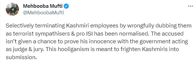 ਸ਼੍ਰੀਨਗਰ- ਪੀਪਲਜ਼ ਡੈਮੋਕ੍ਰਿਟਕ ਪ੍ਰਧਾਨ (PDP) ਮਹਿਬੂਬਾ ਮੁਫਤੀ ਨੇ ਦੋਸ਼ ਲਾਇਆ ਕਿ ਜੰਮੂ-ਕਸ਼ਮੀਰ ਪ੍ਰਸ਼ਾਸਨ ਕਸ਼ਮੀਰੀ ਕਾਮਿਆਂ ਨੂੰ ਅੱਤਵਾਦੀ ਸਮਰਥਕ ਕਰਾਰ ਦੇ ਕੇ ਸੇਵਾ ਤੋਂ ਬਰਖ਼ਾਸਤ ਕਰ ਰਿਹਾ ਹੈ। ਮਹਿਬੂਬਾ ਦੀ ਇਹ ਪ੍ਰਕਿਰਿਆ ਜੰਮੂ-ਕਸ਼ਮੀਰ ਬੈਂਕ ਵਲੋਂ 'ਸੂਬੇ ਦੀ ਸੁਰੱਖਿਆ ਲਈ ਖ਼ਤਰਾ' ਹੋਣ ਦੇ ਦੋਸ਼ 'ਚ ਆਪਣੇ ਮੁੱਖ ਪ੍ਰਬੰਧਕ ਸੱਜਾਦ ਅਹਿਮਦ ਬਜ਼ਾਜ਼ ਨੂੰ ਬਰਖ਼ਾਸਤ ਕੀਤੇ ਜਾਣ ਦੇ ਇਕ ਦਿਨ ਬਾਅਦ ਆਈ ਹੈ। ਸਾਬਕਾ ਮੁੱਖ ਮੰਤਰੀ ਮੁਫਤੀ ਨੇ ਐਕਸ (ਜੋ ਪਹਿਲਾਂ ਟਵਿੱਟਰ ਸੀ) 'ਤੇ ਇਕ ਪੋਸਟ 'ਚ ਕਿਹਾ ਕਿ ਕਸ਼ਮੀਰੀ ਕਾਮਿਆਂ ਨੂੰ ਅੱਤਵਾਦੀ ਸਮਰਥਕ ਅਤੇ ਆਈ. ਐੱਸ. ਆਈ. ਸਮਰਥਕ ਦੱਸ ਕੇ ਚੁਨਿੰਦਾ ਤਰੀਕੇ ਨਾਲ ਬਰਖ਼ਾਸਤ ਕਰਨਾ ਆਮ ਹੋ ਗਿਆ ਹੈ। ਉਨ੍ਹਾਂ ਕਿਹਾ ਕਿ ਜਦੋਂ ਸਰਕਾਰ ਜੱਜ ਅਤੇ ਜਿਊਰੀ ਦੀ ਭੂਮਿਕਾ ਨਿਭਾ ਰਹੀ ਹੁੰਦੀ ਹੈ ਤਾਂ ਦੋਸ਼ੀ ਨੂੰ ਆਪਣੀ ਬੇਗੁਨਾਹੀ ਸਾਬਤ ਕਰਨ ਦਾ ਮੌਕਾ ਨਹੀਂ ਦਿੱਤਾ ਜਾਂਦਾ।