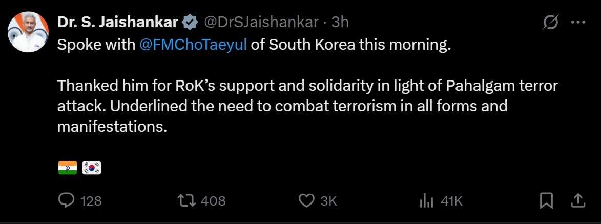 ਵਿਦੇਸ਼ ਮੰਤਰੀ ਨੇ 'ਐਕਸ' 'ਤੇ ਪੋਸਟ ਕਰ ਕਿਹਾ, "ਅੱਜ ਸਵੇਰੇ ਦੱਖਣੀ ਕੋਰੀਆ ਦੇ ਵਿਦੇਸ਼ ਮੰਤਰੀ ਚੋ ਤਾਈ-ਯੂਲ ਨਾਲ ਫ਼ੋਨ 'ਤੇ ਗੱਲ ਕੀਤੀ।" ਉਨ੍ਹਾਂ ਨੇ ਪਹਿਲਗਾਮ ਅੱਤਵਾਦੀ ਹਮਲੇ ਦੇ ਮੱਦੇਨਜ਼ਰ ਕੋਰੀਆ ਗਣਰਾਜ ਦੇ ਸਮਰਥਨ ਅਤੇ ਏਕਤਾ ਲਈ ਧੰਨਵਾਦ ਕੀਤਾ। ਅੱਤਵਾਦ ਦੇ ਸਾਰੇ ਰੂਪਾਂ ਅਤੇ ਪ੍ਰਗਟਾਵੇ ਨਾਲ ਲੜਨ ਦੀ ਲੋੜ 'ਤੇ ਜ਼ੋਰ ਦਿੱਤਾ। ਸੰਯੁਕਤ ਰਾਸ਼ਟਰ ਸੁਰੱਖਿਆ ਪ੍ਰੀਸ਼ਦ ਦੇ 15 ਮੈਂਬਰ ਹਨ, ਜਿਨ੍ਹਾਂ ਵਿੱਚ ਪੰਜ ਸਥਾਈ ਮੈਂਬਰ - ਚੀਨ, ਫਰਾਂਸ, ਰੂਸ, ਬ੍ਰਿਟੇਨ ਅਤੇ ਸੰਯੁਕਤ ਰਾਜ ਅਮਰੀਕਾ ਸ਼ਾਮਲ ਹਨ। ਇਸ ਦੇ 10 ਗੈਰ-ਸਥਾਈ ਮੈਂਬਰ ਵੀ ਹਨ, ਜਿਨ੍ਹਾਂ ਨੂੰ ਜਨਰਲ ਅਸੈਂਬਲੀ ਦੁਆਰਾ ਦੋ ਸਾਲਾਂ ਲਈ ਚੁਣਿਆ ਜਾਂਦਾ ਹੈ।