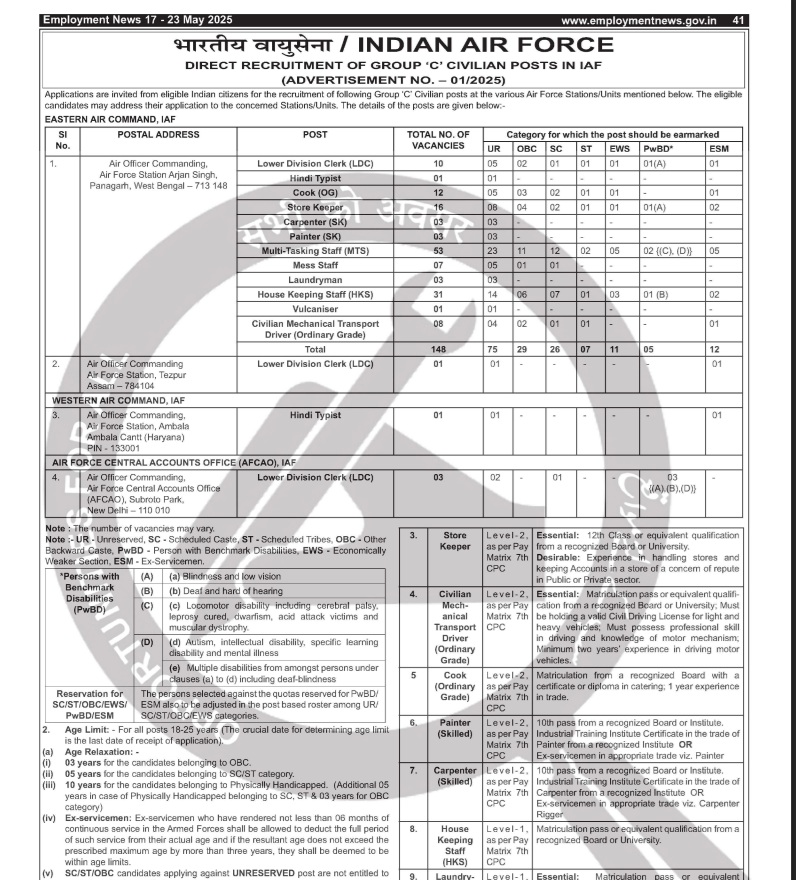ਨਵੀਂ ਦਿੱਲੀ- ਜੇਕਰ ਤੁਸੀਂ ਵੀ ਭਾਰਤੀ ਹਵਾਈ ਫ਼ੌਜ 'ਚ ਭਰਤੀ ਹੋਣਾ ਚਾਹੁੰਦੇ ਹੋ ਤਾਂ ਤੁਹਾਡੇ ਲਈ ਬਿਹਤਰੀਨ ਮੌਕਾ ਹੈ। ਭਾਰਤੀ ਹਵਾਈ ਫ਼ੌਜ ਨੇ 'ਗਰੁੱਪ ਸੀ' ਸਿਵੀਲੀਅਨ ਅਸਾਮੀਆਂ ਲਈ ਫਾਰਮ ਜਾਰੀ ਕੀਤੇ ਹਨ। ਇਹ ਭਰਤੀਆਂ ਲੋਅਰ ਡਿਵੀਜ਼ਨ ਕਲਰਕ, ਹਿੰਦੀ ਟਾਈਪਿਸਟ, ਕੁੱਕ, ਸਟੋਰ ਕੀਪਰ, ਤਰਖਾਣ, MTS ਸਮੇਤ ਕਈ ਅਸਾਮੀਆਂ ਲਈ ਆਈਆਂ ਹਨ। ਇਸ ਭਰਤੀ ਲਈ ਉਮੀਦਵਾਰਾਂ ਨੂੰ ਆਨਲਾਈਨ ਨਹੀਂ ਸਗੋਂ ਆਫ਼ਲਾਈਨ ਅਰਜ਼ੀ ਦੇਣੀ ਪਵੇਗੀ। ਫਾਰਮ ਭੇਜਣ ਦੀ ਆਖਰੀ ਤਾਰੀਖ਼ 15 ਜੂਨ 2025 ਹੈ। ਇਸ ਤੋਂ ਬਾਅਦ ਭੇਜੀਆਂ ਗਈਆਂ ਅਰਜ਼ੀਆਂ ਸਵੀਕਾਰ ਨਹੀਂ ਕੀਤੀਆਂ ਜਾਣਗੀਆਂ।