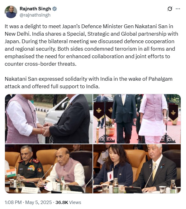 ਰੱਖਿਆ ਮੰਤਰੀ ਨੇ ਦੋ-ਪੱਖੀ ਵਾਰਤਾ ਤੋਂ ਬਾਅਦ ਸੋਸ਼ਲ ਮੀਡੀਆ ਪਲੇਟਫਾਰਮ 'ਐਕਸ' 'ਤੇ ਕਿਹਾ,''ਨਵੀਂ ਦਿੱਲੀ 'ਚ ਜਾਪਾਨ ਦੇ ਰੱਖਇਆ ਮੰਤਰੀ ਜਨਰਲ ਨਾਕਾਤਾਨੀ ਸੈਨ ਨੂੰ ਮਿਲ ਕੇ ਬਹੁਤ ਖੁਸ਼ੀ ਹੋਈ। ਭਾਰਤ ਅਤੇ ਜਾਪਾਨ ਵਿਚਾਲੇ ਵਿਸ਼ੇਸ਼, ਰਣਨੀਤਕ ਅਤੇ ਗਲੋਬਲ ਸਾਂਝੇਦਾਰੀ ਹੈ। ਦੋ-ਪੱਖੀ ਬੈਠਕ ਦੌਰਾਨ ਅਸੀਂ ਰੱਖਿਆ ਸਹਿਯੋਗ ਅਤੇ ਖੇਤਰੀ ਸੁਰੱਖਿਆ 'ਤੇ ਚਰਚਾ ਕੀਤੀ। ਦੋਵਾਂ ਪੱਖਾਂ ਨੇ ਸਾਰੇ ਰੂਪਾਂ 'ਚ ਅੱਤਵਾਦ ਦੀ ਨਿੰਦਾ ਕੀਤੀ ਅਤੇ ਸਰਹੱਦ ਪਾਰ ਖਤਰਿਆਂ ਦਾ ਮੁਕਾਬਲਾ ਕਰਨ ਲਈ ਸਹਿਯੋਗ ਅਤੇ ਸੰਯੁਕਤ ਕੋਸ਼ਿਸ਼ਾਂ ਨੂੰ ਵਧਾਉਣ ਦੀ ਜ਼ਰੂਰਤ 'ਤੇ ਜ਼ੋਰ ਦਿੱਤਾ। ਨਾਕਾਤਾਨੀ ਸੈਨ ਨੇ ਪਹਿਲਗਾਮ ਹਮਲੇ ਦੇ ਮੱਦੇਨਜ਼ਰ ਭਾਰਤ ਨਾਲ ਇਕਜੁਟਤਾ ਜ਼ਾਹਰ ਕੀਤੀ ਅਤੇ ਭਾਰਤ ਨੂੰ ਪੂਰਾ ਸਮਰਥਨ ਦੇਣ ਦੀ ਪੇਸ਼ਕਸ਼ ਕੀਤੀ।''