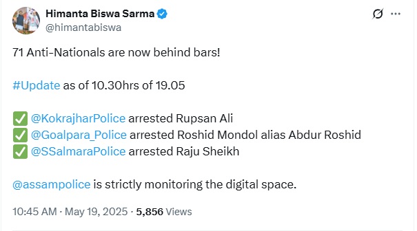ਗੁਹਾਟੀ- ਆਸਾਮ ਦੇ ਮੁੱਖ ਮੰਤਰੀ ਹਿਮੰਤ ਬਿਸਵਾ ਸ਼ਰਮਾ ਨੇ ਸੋਮਵਾਰ ਨੂੰ ਕਿਹਾ ਕਿ ਪਹਿਲਗਾਮ ਅੱਤਵਾਦੀ ਹਮਲੇ ਤੋਂ ਬਾਅਦ 'ਦੇਸ਼ ਵਿਰੋਧੀ' ਗਤੀਵਿਧੀਆਂ 'ਚ ਸ਼ਾਮਲ ਹੋਣ ਦੇ ਦੋਸ਼ 'ਚ ਤਿੰਨ ਹੋਰ ਲੋਕਾਂ ਨੂੰ ਗ੍ਰਿਫ਼ਤਾਰ ਕੀਤਾ ਗਿਆ ਹੈ, ਜਿਸ ਨਾਲ ਰਾਜ 'ਚ ਅਜਿਹੇ ਮਾਮਲਿਆਂ 'ਚ ਗ੍ਰਿਫ਼ਤਾਰ ਕੀਤੇ ਗਏ ਲੋਕਾਂ ਦੀ ਗਿਣਤੀ 71 ਹੋ ਗਈ ਹੈ। ਸੋਸ਼ਲ ਮੀਡੀਆ ਪਲੇਟਫਾਰਮ 'ਐਕਸ' 'ਤੇ ਇਕ ਪੋਸਟ 'ਚ ਸ਼ਰਮਾ ਨੇ ਕਿਹਾ ਕਿ ਕੋਕਰਾਝਾਰ, ਗੋਲਪਾਰਾ ਅਤੇ ਦੱਖਣੀ ਸਲਮਾਰਾ-ਮਾਨਕਾਚਰ ਜ਼ਿਲ੍ਹਿਆਂ ਤੋਂ ਇਕ-ਇਕ ਵਿਅਕਤੀ ਨੂੰ ਗ੍ਰਿਫ਼ਤਾਰ ਕੀਤਾ ਗਿਆ ਹੈ। ਉਨ੍ਹਾਂ ਕਿਹਾ,“71 ਗੱਦਾਰ ਹੁਣ ਸਲਾਖਾਂ ਪਿੱਛੇ ਹਨ! ਆਸਾਮ ਪੁਲਸ ਡਿਜੀਟਲ ਮਾਧਿਅਮਾਂ 'ਤੇ ਸਖ਼ਤ ਨਜ਼ਰ ਰੱਖ ਰਹੀ ਹੈ।''