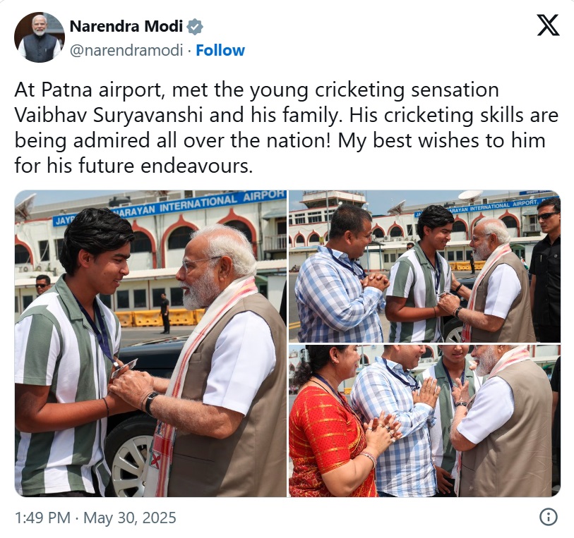 ਪ੍ਰਧਾਨ ਮੰਤਰੀ ਰਾਜ ਦੇ 2 ਦਿਨਾਂ ਦੌਰੇ 'ਤੇ ਸਨ। ਪ੍ਰਧਾਨ ਮੰਤਰੀ ਮੋਦੀ ਨੇ ਲਿਖਿਆ, "ਪਟਨਾ ਹਵਾਈ ਅੱਡੇ 'ਤੇ ਨੌਜਵਾਨ ਕ੍ਰਿਕਟਰ ਵੈਭਵ ਸੂਰਿਆਵੰਸ਼ੀ ਅਤੇ ਉਨ੍ਹਾਂ ਦੇ ਪਰਿਵਾਰ ਨਾਲ ਮੁਲਾਕਾਤ ਹੋਈ। ਉਨ੍ਹਾਂ ਦੇ ਕ੍ਰਿਕਟ ਹੁਨਰ ਦੀ ਪੂਰੇ ਦੇਸ਼ ਵਿੱਚ ਪ੍ਰਸ਼ੰਸਾ ਕੀਤੀ ਜਾ ਰਹੀ ਹੈ। ਉਨ੍ਹਾਂ ਦੇ ਭਵਿੱਖ ਦੇ ਯਤਨਾਂ ਲਈ ਮੇਰੀਆਂ ਸ਼ੁਭਕਾਮਨਾਵਾਂ।" ਮਾਰਚ ਵਿੱਚ 14 ਸਾਲ ਦੇ ਹੋਏ ਸੂਰਿਆਵੰਸ਼ੀ ਬਿਹਾਰ ਦੇ ਸਮਸਤੀਪੁਰ ਜ਼ਿਲ੍ਹੇ ਤੋਂ ਹਨ।
