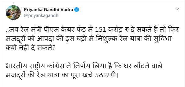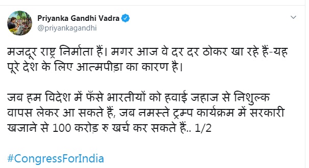 ਉਨ੍ਹਾਂ ਨੇ ਟਵੀਟ ਕੀਤਾ ਕਿ ਮਜ਼ਦੂਰ ਰਾਸ਼ਟਰ ਨਿਰਮਾਤਾ ਹਨ ਪਰ ਅੱਜ ਉਹ ਦਰ-ਦਰ ਦੀਆਂ ਠੋਕਰਾਂ ਖਾ ਰਹੇ ਹਨ। ਇਹ ਦੇਸ਼ ਲਈ ਵੱਡੇ ਦੁੱਖ ਦਾ ਕਾਰਨ ਹੈ। ਪ੍ਰਿਅੰਕਾ ਨੇ ਸਵਾਲ ਕੀਤਾ ਕਿ ਜਦੋਂ ਅਸੀਂ ਵਿਦੇਸ਼ਾਂ 'ਚ ਫਸੇ ਭਾਰਤੀ ਨਾਗਰਿਕਾਂ ਨੂੰ ਹਵਾਈ ਜਹਾਜ਼ ਤੋਂ ਮੁਫ਼ਤ ਵਾਪਸ ਲੈ ਕੇ ਆ ਸਕਦੇ ਹਨ, ਨਮਸਤੇ ਟਰੰਪ ਪ੍ਰੋਗਰਾਮ 'ਚ ਸਰਕਾਰੀ ਖਜ਼ਾਨੇ ਤੋਂ 100 ਕਰੋੜ ਰੁਪਏ ਖਰਚ ਕਰ ਸਕਦੇ ਹਾਂ, ਜਦੋਂ ਰੇਲ ਮੰਤਰੀ ਪੀ. ਐੱਮ. ਕੇਅਰਸ ਫੰਡ 'ਚ 151 ਕਰੋੜ ਰੁਪਏ ਦੇ ਸਕਦੇ ਹਨ ਤਾਂ ਫਿਰ ਮਜ਼ਦੂਰਾਂ ਨੂੰ ਆਫਤ ਦੀ ਇਸ ਘੜੀ ਵਿਚ ਮੁਫ਼ਤ ਰੇਲ ਯਾਤਰਾ ਦੀ ਸਹੂਲਤ ਕਿਉਂ ਨਹੀਂ ਦੇ ਸਕਦੇ?