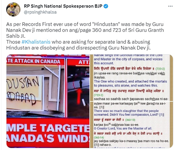 ਆਰ. ਪੀ. ਸਿੰਘ ਨੇ ਆਪਣੇ ਟਵਿੱਟਰ ਹੈਂਡਲ 'ਤੇ ਟਵੀਟ ਕਰ ਕੇ ਲਿਖਿਆ ਕਿ ਰਿਕਾਰਡਾਂ ਮੁਤਾਬਕ "ਹਿੰਦੁਸਤਾਨ" ਸ਼ਬਦ ਦੀ ਵਰਤੋਂ ਸਭ ਤੋਂ ਪਹਿਲਾਂ ਸ੍ਰੀ ਗੁਰੂ ਨਾਨਕ ਦੇਵ ਜੀ ਨੇ ਸ੍ਰੀ ਗੁਰੂ ਗ੍ਰੰਥ ਸਾਹਿਬ ਜੀ ਦੇ ਅੰਗ 360 ਅਤੇ 723 'ਤੇ ਕੀਤੀ ਸੀ। ਜੋ ਖ਼ਾਲਿਸਤਾਨੀ ਵੱਖਰੀ ਜ਼ਮੀਨ ਦੀ ਮੰਗ ਕਰ ਰਹੇ ਹਨ ਅਤੇ ਹਿੰਦੁਸਤਾਨ ਨੂੰ ਗਾਲ੍ਹਾਂ ਕੱਢ ਰਹੇ ਹਨ, ਉਹ ਗੁਰੂ ਨਾਨਕ ਦੇਵ ਜੀ ਦੀ ਬੇਅਦਬੀ ਅਤੇ ਨਿਰਾਦਰ ਕਰ ਰਹੇ ਹਨ।