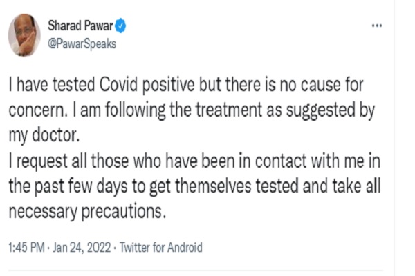 ਮੁੰਬਈ (ਭਾਸ਼ਾ)- ਰਾਸ਼ਟਰਵਾਦੀ ਕਾਂਗਰਸ ਪਾਰਟੀ (ਰਾਕਾਂਪਾ) ਦੇ ਮੁਖੀ ਸ਼ਰਦ ਪਵਾਰ ਨੇ ਸੋਮਵਾਰ ਨੂੰ ਦੱਸਿਆ ਕਿ ਉਹ ਕੋਰੋਨਾ ਵਾਇਰਸ ਨਾਲ ਪੀੜਤ ਹੋ ਗਏ ਹਨ ਪਰ ਚਿੰਤਾ ਦੀ ਕੋਈ ਗੱਲ ਨਹੀਂ ਹੈ। ਸਾਬਕਾ ਕੇਂਦਰੀ ਮੰਤਰੀ ਨੇ ਟਵੀਟ ਕੀਤਾ,''ਮੈਂ ਕੋਰੋਨਾ ਵਾਇਰਸ ਨਾਲ ਪੀੜਤ ਹੋ ਗਿਆ ਹਾਂ ਪਰ ਚਿੰਤਾ ਦੀ ਕੋਈ ਗੱਲ ਨਹੀਂ ਹੈ। ਮੈਂ, ਮੇਰੇ ਡਾਕਟਰ ਦੀ ਸਲਾਹ ਦੀ ਪਾਲਣਾ ਕਰ ਰਿਹਾ ਹਾ।''