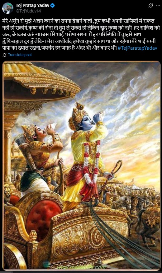 ਇਸ ਮਗਰੋਂ ਹੁਣ ਇਕ ਹੋਰ ਪੋਸਟ ਸਾਂਝੀ ਕਰਦਿਆਂ ਤੇਜ ਪ੍ਰਤਾਪ ਨੇ ਆਪਣੇ ਛੋਟੇ ਭਰਾ ਤੇਜਸਵੀ ਯਾਦਵ ਨੂੰ ਸੰਬੋਧਨ ਕਰਦੇ ਹੋਏ ਲਿਖਿਆ, ''ਮੇਰੇ ਅਰਜੁਨ ਤੋਂ ਵੱਖ ਕਰਨ ਵਾਲਿਓ, ਤੁਸੀਂ ਕਦੇ ਵੀ ਆਪਣੀਆਂ ਸਾਜ਼ਿਸ਼ਾਂ 'ਚ ਕਾਮਯਾਬ ਨਹੀਂ ਹੋ ਸਕੋਗੇ। ਤੁਸੀਂ ਕ੍ਰਿਸ਼ਨ ਦੀ ਸੈਨਾ ਤਾਂ ਲੈ ਸਕਦੇ ਹੋ, ਪਰ ਖ਼ੁਦ ਕ੍ਰਿਸ਼ਨ ਨੂੰ ਨਹੀਂ।''