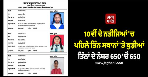 ਜਲੰਧਰ : ਪੰਜਾਬ ਸਕੂਲ ਸਿੱਖਿਆ ਬੋਰਡ ਵਲੋਂ 10ਵੀਂ ਜਮਾਤ ਦੇ ਨਤੀਜਿਆਂ ਦਾ ਐਲਾਨ ਕਰ ਦਿੱਤਾ ਗਿਆ ਹੈ। ਇਨ੍ਹਾਂ ਨਤੀਜਿਆਂ ਦੌਰਾਨ ਕੁੜੀਆਂ ਨੇ ਪੂਰੇ ਪੰਜਾਬ 'ਚੋਂ ਬਾਜ਼ੀ ਮਾਰੀ ਹੈ। ਪਹਿਲੇ ਸਥਾਨ 'ਤੇ ਫ਼ਰੀਦਕੋਟ ਦੀ ਅਕਸ਼ਨੂਰ ਕੌਰ ਰਹੀ ਹੈ, ਜਦੋਂ ਕਿ ਸ੍ਰੀ ਮੁਕਤਸਰ ਸਾਹਿਬ ਦੀ ਰਤਿੰਦਰਦੀਪ ਕੌਰ ਨੇ ਦੂਜਾ ਸਥਾਨ ਹਾਸਲ ਕੀਤਾ ਅਤੇ ਤੀਜੇ ਸਥਾਨ 'ਤੇ ਮਾਲੇਰਕੋਟਲਾ ਦੀ ਅਰਸ਼ਦੀਪ ਕੌਰ ਰਹੀ ਹੈ। ਇਥੇ ਦਿਲਚਸਪ ਗੱਲ ਇਹ ਹੈ ਕਿ ਪੰਜਾਬ ਭਰ ਵਿਚੋਂ ਜਿੱਥੇ ਕੁੜੀਆਂ ਨੇ ਪਹਿਲੇ ਤਿੰਨ ਸਥਾਨਾਂ 'ਤੇ ਬਾਜ਼ੀ ਮਾਰੀ ਹੈ, ਉਥੇ ਹੀ ਤਿੰਨਾਂ ਕੁੜੀਆਂ ਨੇ 650 ਵਿਚੋਂ 650 ਅੰਕ ਹਾਸਲ ਕੀਤੇ ਹਨ।