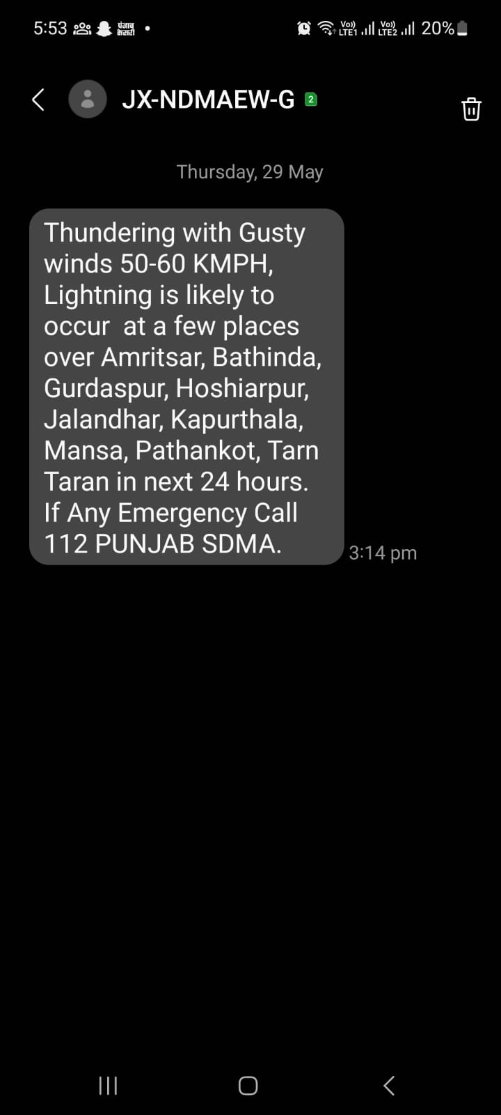 NDMAEW ਯਾਨੀ ਰਾਸ਼ਟਰੀ ਆਫ਼ਤ ਪ੍ਰਬੰਧਨ ਅਥਾਰਟੀ ਵੱਲੋਂ ਹਵਾਲਾ ਦਿੰਦੇ ਹੋਏ ਭੇਜੇ ਗਏ ਇਨ੍ਹਾਂ ਸੁਨੇਹਿਆਂ ਵਿੱਚ ਸਪੱਸ਼ਟ ਤੌਰ 'ਤੇ ਕਿਹਾ ਗਿਆ ਹੈ ਕਿ ਅਗਲੇ 24 ਘੰਟਿਆਂ ਵਿੱਚ ਅੰਮ੍ਰਿਤਸਰ, ਬਠਿੰਡਾ, ਗੁਰਦਾਸਪੁਰ, ਹੁਸ਼ਿਆਰਪੁਰ, ਜਲੰਧਰ, ਕਪੂਰਥਲਾ, ਮਾਨਸਾ, ਪਠਾਨਕੋਟ, ਤਰਨਤਾਰਨ ਵਿੱਚ ਕੁਝ ਥਾਵਾਂ 'ਤੇ 50-60 ਕਿਲੋਮੀਟਰ ਪ੍ਰਤੀ ਘੰਟਾ ਦੀ ਰਫ਼ਤਾਰ ਨਾਲ ਤੇਜ਼ ਹਵਾਵਾਂ ਚੱਲਣ ਅਤੇ ਬਿਜਲੀ ਡਿੱਗਣ ਦੀ ਸੰਭਾਵਨਾ ਹੈ। ਇਸ ਦੇ ਨਾਲ ਹੀ, ਕਿਸੇ ਵੀ ਐਮਰਜੈਂਸੀ ਦੀ ਸਥਿਤੀ ਵਿੱਚ, 112 PUNJAB SDMA ਨਾਲ ਸੰਪਰਕ ਕਰਨ ਲਈ ਕਿਹਾ ਗਿਆ ਹੈ।