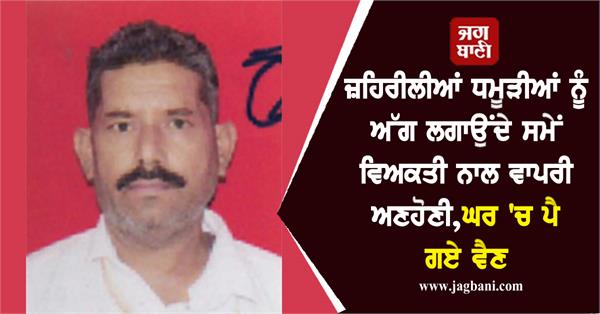 ਗੁਰਦਾਸਪੁਰ (ਹਰਮਨ): ਕਾਹਨੂੰਵਾਨ ਕਸਬੇ ਵਿਚ ਅੱਜ ਦੁਪਹਿਰ ਇੱਕ ਦਰਦਨਾਕ ਹਾਦਸਾ ਵਾਪਰਿਆ ਜਦੋਂ ਇਕ ਵਿਅਕਤੀ ਜ਼ਹਿਰੀਲੀਆਂ ਧਮੂੜੀਆਂ ਨੂੰ ਅੱਗ ਨਾਲ ਸਾੜਦੇ ਸਮੇਂ ਆਪ ਹੀ ਅੱਗ ਦੀ ਲਪੇਟ ਵਿੱਚ ਆ ਗਿਆ ਅਤੇ ਮੌਕੇ 'ਤੇ ਹੀ ਉਸ ਦੀ ਮੌਤ ਹੋ ਗਈ। ਜਾਣਕਾਰੀ ਮੁਤਾਬਕ, ਕਾਹਨੂੰਵਾਨ ਵਾਸੀ ਦਲੀਪ ਸਿੰਘ ਪੁੱਤਰ ਭੀਖਮ ਸਿੰਘ ਅੱਜ ਦੁਪਹਿਰ ਆਪਣੇ ਘਰ ਵਿੱਚ ਇਕੱਲਾ ਸੀ। ਉਸ ਦੀ ਪਤਨੀ ਕਿਸੇ ਕੰਮ ਵਾਸਤੇ ਕਿਸੇ ਹੋਰ ਘਰ ਗਈ ਹੋਈ ਸੀ। ਦਲੀਪ ਸਿੰਘ ਨੇ ਘਰ ਦੀ ਛੱਤ 'ਤੇ ਪਈਆਂ ਲੱਕੜੀਆਂ ਅਤੇ ਧਮੋੜੀਆਂ ਨੂੰ ਡੀਜ਼ਲ ਦੇ ਨਾਲ ਸਾੜਣ ਦੀ ਕੋਸ਼ਿਸ਼ ਕੀਤੀ। ਇਸ ਦੌਰਾਨ ਡੀਜ਼ਲ ਨੇ ਅੱਗ ਨੂੰ ਹੋਰ ਭੜਕਾ ਦਿੱਤਾ ਤੇ ਜਦੋਂ ਉਹ ਅੱਗ ਤੋਂ ਪਿੱਛੇ ਹਟਣ ਲੱਗਿਆ ਤਾਂ ਪੌੜੀ ਅਤੇ ਲੱਕੜਾਂ ਸਮੇਤ ਹੇਠਾਂ ਡਿੱਗ ਪਿਆ। ਡਿੱਗਣ ਨਾਲ ਉਹ ਭੜਕਦੀ ਅੱਗ ਦੀ ਲਪੇਟ 'ਚ ਆ ਗਿਆ ਜਿਸ ਕਾਰਨ ਉਸ ਦੀ ਮੌਕੇ 'ਤੇ ਹੀ ਮੌਤ ਹੋ ਗਈ।