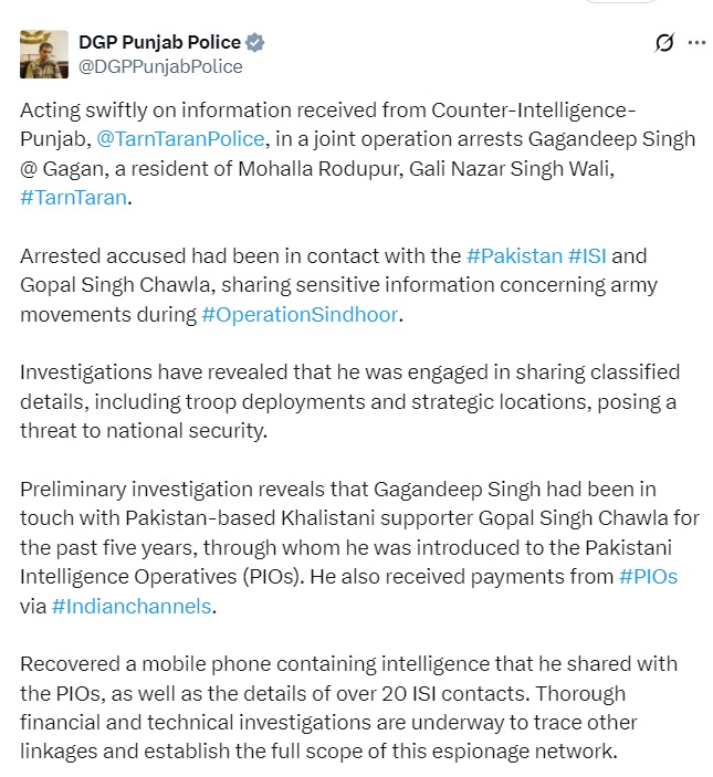 ਤਰਨਤਾਰਨ/ਚੰਡੀਗੜ੍ਹ (ਵੈੱਬ ਡੈਸਕ, ਰਮਨ) : ਤਰਨਤਾਰਨ ਪੁਲਸ ਵਲੋਂ ਕਾਊਂਟਰ ਇੰਟੈਲੀਜੈਂਸ ਪੰਜਾਬ ਦੀ ਜਾਣਕਾਰੀ 'ਤੇ ਤੇਜ਼ੀ ਨਾਲ ਕਾਰਵਾਈ ਕਰਦੇ ਹੋਏ ਸਾਂਝੇ ਆਪਰੇਸ਼ਨ ਦੌਰਾਨ ਵੱਡੀ ਜਾਸੂਸੀ ਸਾਜ਼ਿਸ਼ ਦਾ ਪਰਦਾਫਾਸ਼ ਕੀਤਾ ਗਿਆ ਹੈ। ਪੁਲਸ ਵਲੋਂ ਗਗਨਦੀਪ ਸਿੰਘ ਉਰਫ਼ ਗਗਨ, ਮੁਹੱਲਾ ਰੋਡੂਪੁਰ, ਗਲੀ ਨਜ਼ਰ ਸਿੰਘ ਵਾਲੀ, ਤਰਨਤਾਰਨ ਨੂੰ ਗ੍ਰਿਫ਼ਤਾਰ ਕੀਤਾ ਗਿਆ ਹੈ। ਗ੍ਰਿਫ਼ਤਾਰ ਮੁਲਜ਼ਮ 'ਆਪਰੇਸ਼ਨ ਸਿੰਦੂਰ' ਦੌਰਾਨ ਫ਼ੌਜ ਦੀਆਂ ਗਤੀਵਿਧੀਆਂ ਬਾਰੇ ਸੰਵੇਦਨਸ਼ੀਲ ਜਾਣਕਾਰੀ ਪਾਕਿਸਤਾਨ ਦੀ ਆਈ. ਐੱਸ. ਆਈ. ਅਤੇ ਗੋਪਾਲ ਸਿੰਘ ਚਾਵਲਾ ਦੇ ਨਾਲ ਸਾਂਝੀ ਕਰਦਾ ਸੀ। ਮੁੱਢਲੀ ਜਾਂਚ ਤੋਂ ਪਤਾ ਲੱਗਾ ਹੈ ਕਿ ਉਹ ਰਾਸ਼ਟਰੀ ਸੁਰੱਖਿਆ ਲਈ ਖ਼ਤਰਾ ਪੈਦਾ ਕਰਨ ਵਾਲੇ ਫ਼ੌਜ ਦੀ ਤਾਇਨਾਤੀ ਅਤੇ ਰਣਨੀਤੀਕ ਸਥਾਨਾਂ ਸਮੇਤ ਵਰਗੀਕ੍ਰਿਤ ਵੇਰਵੇ ਸਾਂਝੇ ਕਰਨ 'ਚ ਰੁੱਝਿਆ ਹੋਇਆ ਸੀ।