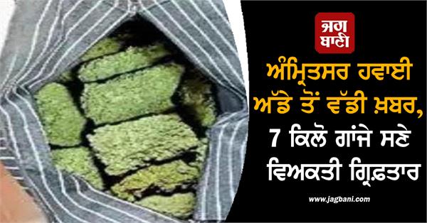 ਅੰਮ੍ਰਿਤਸਰ (ਬਿਊਰੋ)- ਅੰਮ੍ਰਿਤਸਰ ਸ੍ਰੀ ਗੁਰੂ ਰਾਮਦਾਸ ਅੰਤਰਰਾਸ਼ਟਰੀ ਹਵਾਈ ਅੱਡੇ ਤੋਂ ਵੱਡੀ ਖ਼ਬਰ ਸਾਹਮਣੇ ਆਈ ਹੈ। ਜਾਣਕਾਰੀ ਮੁਤਾਬਕ ਅੰਮ੍ਰਿਤਸਰ ਕਸਟਮ ਵਿਭਾਗ ਨੇ ਵੱਡੀ ਕਾਰਵਾਈ ਕਰਦਿਆਂ ਮਲੇਸ਼ੀਆ ਤੋਂ ਆਏ ਇੱਕ ਯਾਤਰੀ ਨੂੰ 7 ਕਿਲੋ ਗਾਂਜੇ ਸਮੇਤ ਗ੍ਰਿਫ਼ਤਾਰ ਕੀਤਾ ਗਿਆ ਹੈ।