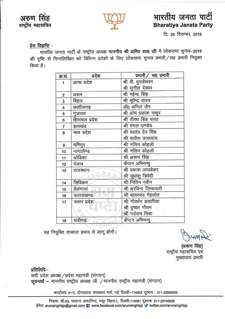 ਨਵੀਂ ਦਿੱਲੀ— ਲੋਕਸਭਾ ਚੋਣਾਂ ਨੂੰ ਧਿਆਨ 'ਚ ਰੱਖਦੇ ਹੋਏ ਭਾਜਪਾ ਨੇ ਕਮਰ ਕੱਸ ਲਈ ਹੈ। ਪੰਜਾਬ 'ਚ ਲੋਕਸਭਾ ਚੋਣਾਂ ਦੀ ਕਮਾਨ ਭਾਜਪਾ ਹਾਈ ਕਮਾਂਡ ਨੇ ਕੈਪਟਨ ਦੇ ਹੱਥ ਫੜ੍ਹਾ ਦਿੱਤੀ ਹੈ। ਅਸੀਂ ਸੂਬੇ ਦੇ ਮੁੱਖ ਮੰਤਰੀ ਕੈਪਟਨ ਅਮਰਿੰਦਰ ਸਿੰਘ ਦੀ ਗੱਲ ਨਹੀਂ ਕਰ ਰਹੇ ਸਗੋਂ ਅਸੀਂ ਗੱਲ ਕਰ ਰਹੇ ਹਾਂ ਹਰਿਆਣਾ ਭਾਜਪਾ ਦੇ ਆਗੂ ਕੈਪਟਨ ਅਭਿਮੰਨਿਊ ਸਿੰਘ ਦੀ। ਭਾਜਪਾ ਵੱਲੋਂ ਲੋਕਸਭਾ ਚੋਣਾਂ ਨੂੰ ਧਿਆਨ 'ਚ ਰੱਖਦੇ ਹੋਏ ਵੱਖ-ਵੱਖ ਸੂਬਿਆਂ ਦੇ 17 ਜਰਨੈਲਾਂ (ਇੰਚਾਰਜ) ਦੀ ਨਿਯੁਕਤੀ ਕੀਤੀ ਗਈ ਹੈ।