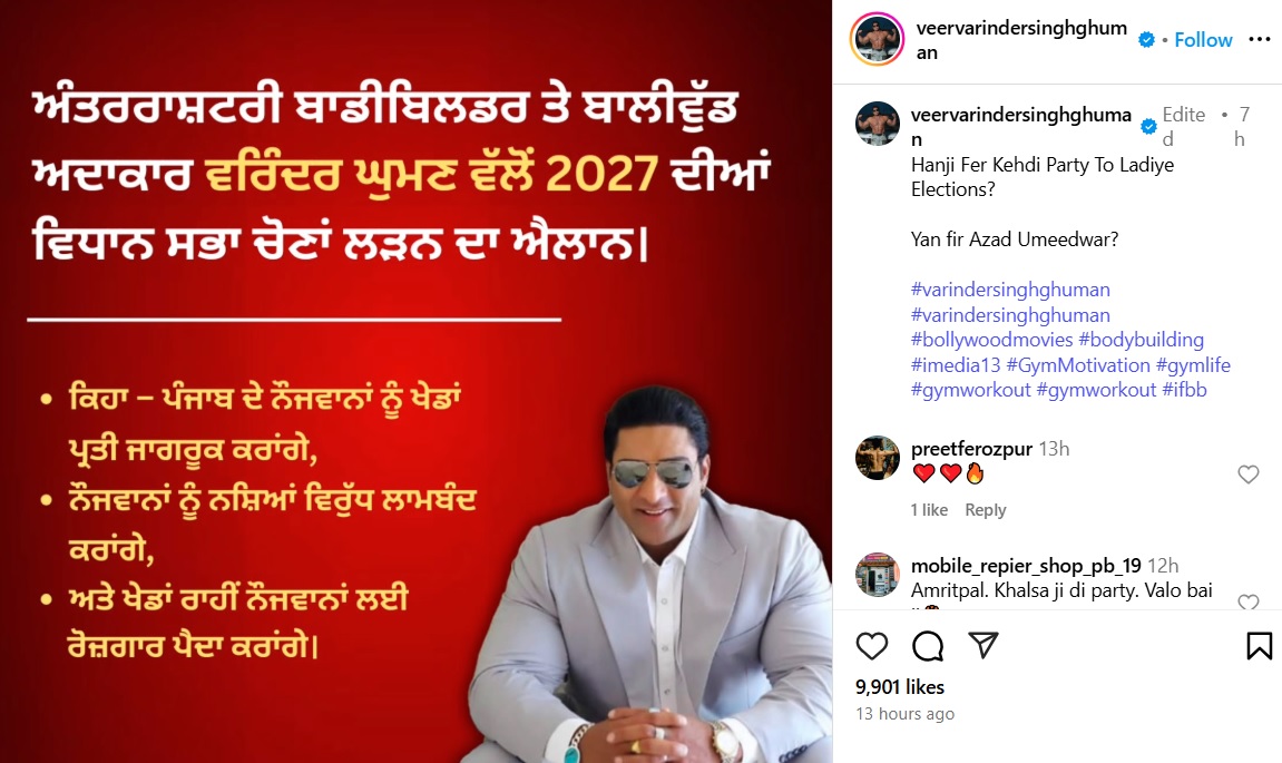 ਐਂਟਰਟੇਨਮੈਂਟ ਡੈਸਕ- ਪ੍ਰਸਿੱਧ ਬਾਡੀ ਬਿਲਡਰ ਅਤੇ ਐਕਟਰ ਵਰਿੰਦਰ ਘੁੰਮਣ ਨੇ ਪੰਜਾਬ ਦੀ ਰਾਜਨੀਤੀ ਵਿੱਚ ਐਂਟਰੀ ਕਰਨ ਦਾ ਐਲਾਨ ਕਰ ਦਿੱਤਾ ਹੈ। ਇਸ ਸਬੰਧੀ ਉਨ੍ਹਾਂ ਨੇ ਆਪਣੇ ਇੰਸਟਾਗ੍ਰਾਮ ਅਕਾਊਂਟ 'ਤੇ ਇਕ ਪੋਸਟ ਵੀ ਸਾਂਝੀ ਕੀਤਾ ਹੈ, ਜਿਸ ਵਿਚ ਉਨ੍ਹਾਂ ਦੱਸਿਆ ਕਿ ਉਹ 2027 ਦੀਆਂ ਵਿਧਾਨ ਸਭਾ ਚੋਣਾਂ ਵਿੱਚ ਹਿੱਸਾ ਲੈਣਗੇ। ਆਪਣੀ ਫਿਟਨੈੱਸ ਅਤੇ ਦਿਲੇਰੀ ਲਈ ਮਸ਼ਹੂਰ ਘੁੰਮਣ ਨੇ ਕਿਹਾ ਕਿ ਹੁਣ ਉਹ ਲੋਕਾਂ ਦੀ ਸੇਵਾ ਕਰਨਾ ਚਾਹੁੰਦੇ ਹਨ ਅਤੇ ਪੰਜਾਬ ਦੀ ਨੌਜਵਾਨ ਪੀੜ੍ਹੀ ਲਈ ਸਹੀ ਰਸਤਾ ਤੈਅ ਕਰਨਾ ਚਾਹੁੰਦੇ ਹਨ।