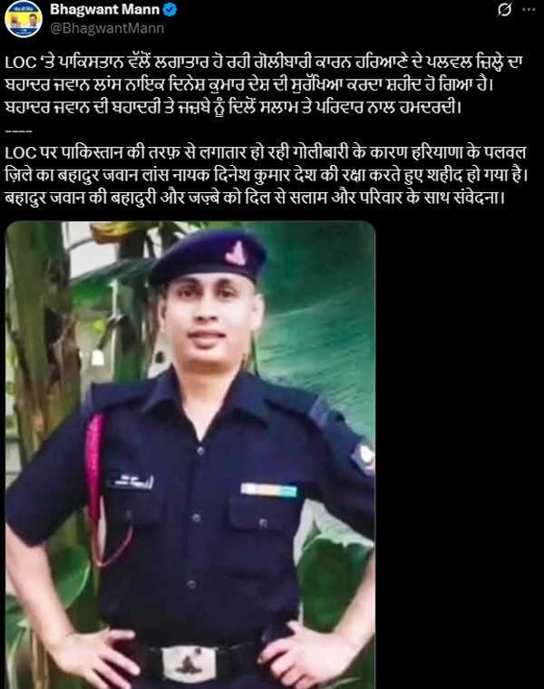 ਜਲੰਧਰ (ਵੈੱਬ ਡੈਸਕ)- LOC 'ਤੇ ਪਾਕਿਸਤਾਨ ਵੱਲੋਂ ਕੀਤੀ ਗਈ ਗੋਲ਼ੀਬਾਰੀ ਦੌਰਾਨ ਹੋਏ ਮੁਕਾਬਲੇ ਵਿਚ ਹਰਿਆਣਾ ਦੇ ਪਲਵਲ ਦਾ ਲਾਂਸ ਨਾਇਕ ਦਿਨੇਸ਼ ਕੁਮਾਰ ਸ਼ਹੀਦ ਹੋ ਗਿਆ। ਮੁਕਾਬਲੇ ਦੌਰਾਨ ਦਿਨੇਸ਼ ਦੇ ਸ਼ਹੀਦ ਹੋਣ 'ਤੇ ਮੁੱਖ ਮੰਤਰੀ ਭਗਵੰਤ ਮਾਨ ਨੇ ਦੁੱਖ ਦਾ ਪ੍ਰਗਟਾਵਾ ਕੀਤਾ ਹੈ। ਮੁੱਖ ਮੰਤਰੀ ਭਗਵੰਤ ਮਾਨ ਨੇ ਕਿਹਾ ਕਿ ਐੱਲ. ਓ. ਸੀ. 'ਤੇ ਪਾਕਿਸਤਾਨ ਵੱਲੋਂ ਲਗਾਤਾਰ ਹੋ ਰਹੀ ਗੋਲ਼ੀਬਾਰੀ ਕਾਰਨ ਹਰਿਆਣਾ ਦੇ ਪਲਵਲ ਜ਼ਿਲ੍ਹੇ ਦਾ ਬਹਾਦਰ ਜਵਾਨ ਲਾਂਸ ਨਾਇਕ ਦਿਨੇਸ਼ ਕੁਮਾਰ ਦੇਸ਼ ਦੀ ਸੁਰੱਖਿਆ ਕਰਦਾ ਸ਼ਹੀਦ ਹੋ ਗਿਆ ਹੈ। ਬਹਾਦਰ ਜਵਾਨ ਦੀ ਬਹਾਦਰੀ ਅਤੇ ਜਜ਼ਬੇ ਨੂੰ ਦਿਲੋਂ ਸਲਾਮ ਅਤੇ ਪਰਿਵਾਰ ਨਾਲ ਹਮਦਰਦੀ।
