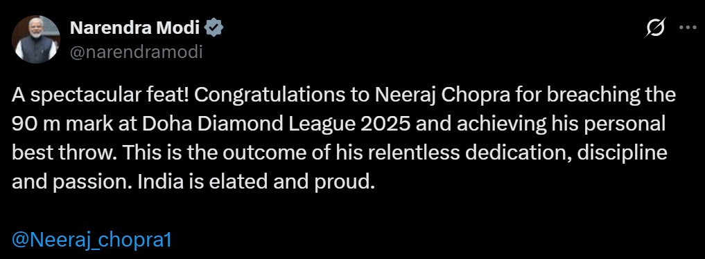ਜ਼ਿਕਰਯੋਗ ਹੈ ਕਿ ਇਸ ਤੋਂ ਪਹਿਲਾਂ ਪ੍ਰਧਾਨ ਮੰਤਰੀ ਨਰਿੰਦਰ ਮੋਦੀ ਨੇ ਵੀ ਨੀਰਜ ਚੋਪੜਾ ਨੂੰ ਇਸ ਸ਼ਾਨਦਾਰ ਉਪਲੱਬਧੀ ਲਈ ਵਧਾਈਆਂ ਦਿੱਤੀਆਂ ਸਨ। ਉਨ੍ਹਾਂ ਆਪਣੇ ਐਕਸ ਅਕਾਊਂਟ 'ਤੇ ਪੋਸਟ ਪਾ ਕੇ ਕਿਹਾ ਸੀ ਕਿ ਨੀਰਜ ਚੋਪੜਾ ਨੂੰ ਇਹ ਨਤੀਜਾ ਉਸ ਦੀ ਅਣਥੱਕ ਮਿਹਨਤ, ਲਗਨ ਤੇ ਸ਼ੌਂਕ ਨਾਲ ਮਿਲਿਆ ਹੈ। ਪੂਰੇ ਦੇਸ਼ ਨੂੰ ਉਨ੍ਹਾਂ 'ਤੇ ਮਾਣ ਹੈ।