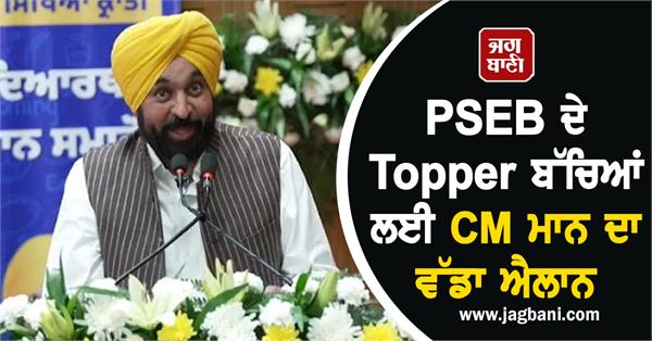 ਚੰਡੀਗੜ੍ਹ : ਪੰਜਾਬ ਸਕੂਲ ਸਿੱਖਿਆ ਬੋਰਡ ਦੇ 10ਵੀਂ ਅਤੇ 12ਵੀਂ ਜਮਾਤ 'ਚੋਂ ਟੌਪ ਕਰਨ ਵਾਲੇ ਵਿਦਿਆਰਥੀਆਂ ਲਈ ਮੁੱਖ ਮੰਤਰੀ ਭਗਵੰਤ ਮਾਨ ਵਲੋਂ ਵੱਡਾ ਐਲਾਨ ਕੀਤਾ ਗਿਆ ਹੈ। ਉਨ੍ਹਾਂ ਨੇ ਐਲਾਨ ਕਰਦਿਆਂ ਕਿਹਾ ਹੈ ਕਿ ਜਿਹੜੇ ਵਿਦਿਆਰਥੀਆਂ ਨੇ ਪੂਰੇ ਪੰਜਾਬ 'ਚੋਂ ਟੌਪ-10 ਕੀਤਾ ਹੈ, 12ਵੀਂ ਜਮਾਤ 'ਚੋਂ ਟੌਪ-10 ਕੀਤਾ ਹੈ ਅਤੇ ਇਸ ਦੇ ਨਾਲ ਹੀ ਦੋਹਾਂ ਜਮਾਤਾਂ ਦੇ ਜ਼ਿਲ੍ਹਿਆਂ ਦੇ ਟੌਪਰ ਬੱਚਿਆਂ ਨੂੰ ਜਹਾਜ਼ਾਂ ਦਾ ਝੂਟਾ ਦਿਵਾਇਆ ਜਾਵੇਗਾ।