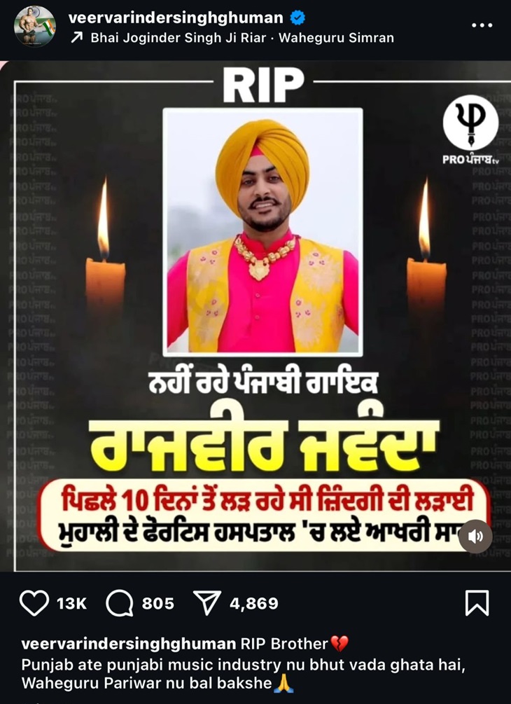ਵਰਿੰਦਰ ਸਿੰਘ ਘੁੰਮਣ ਨੇ ਪੰਜਾਬੀ ਗਾਇਕ ਰਾਜਵੀਰ ਜਵੰਦਾ ਦੀ ਮੌਤ 'ਤੇ ਦੁੱਖ ਪ੍ਰਗਟ ਕੀਤਾ ਸੀ। ਉਨ੍ਹਾਂ ਨੇ ਸੋਸ਼ਲ ਮੀਡੀਆ 'ਤੇ ਪੋਸਟ ਕਰਦੇ ਹੋਏ ਲਿਖਿਆ, "RIP Brother। ਪੰਜਾਬ ਅਤੇ ਪੰਜਾਬੀ ਸੰਗੀਤ ਉਦਯੋਗ ਨੂੰ ਬਹੁਤ ਵੱਡਾ ਘਾਟਾ ਪਿਆ ਹੈ।"