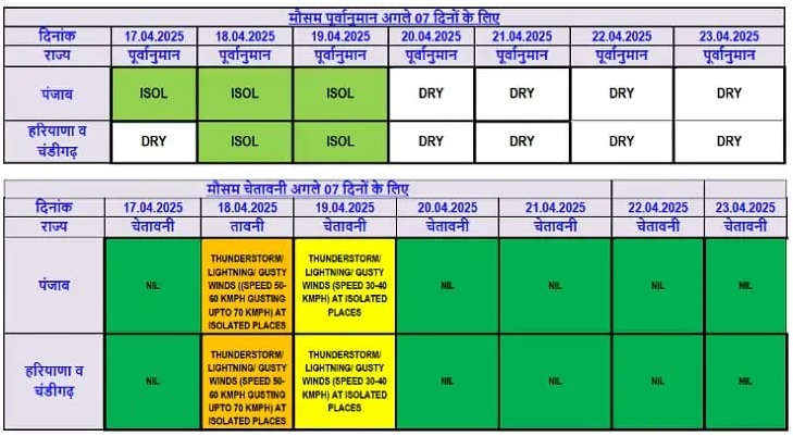 ਇਸ ਦੇ ਨਾਲ ਹੀ 5 ਜ਼ਿਲ੍ਹਿਆਂ ਤਰਨਤਾਰਨ, ਕਪੂਰਥਲਾ, ਜਲੰਧਰ, ਲੁਧਿਆਣਾ ਅਤੇ ਪਟਿਆਲਾ ਵਿੱਚ ਮੀਂਹ ਅਤੇ ਤੂਫ਼ਾਨ ਨੂੰ ਲੈ ਕੇ ਪੀਲਾ ਅਲਰਟ ਜਾਰੀ ਕੀਤਾ ਗਿਆ ਹੈ। ਇਸ ਸਮੇਂ ਦੌਰਾਨ, ਪੰਜਾਬ ਵਿੱਚ 40 ਕਿਲੋਮੀਟਰ ਪ੍ਰਤੀ ਘੰਟਾ ਦੀ ਰਫ਼ਤਾਰ ਨਾਲ ਤੇਜ਼ ਹਵਾਵਾਂ ਚੱਲਣ ਦੀ ਸੰਭਾਵਨਾ ਹੈ।