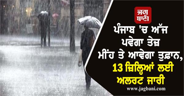 ਚੰਡੀਗੜ੍ਹ- ਪੰਜਾਬ ਦੇ ਲੋਕਾਂ ਨੂੰ ਅੱਜ ਗਰਮੀ ਤੋਂ ਰਾਹਤ ਮਿਲਣੀ ਸ਼ੁਰੂ ਹੋਵੇਗੀ। ਮੌਸਮ ਵਿਗਿਆਨ ਕੇਂਦਰ ਅਨੁਸਾਰ ਅੱਜ ਪੰਜਾਬ ਵਿੱਚ ਮੀਂਹ ਅਤੇ ਤੂਫ਼ਾਨ ਲਈ ਸੰਤਰੀ ਅਲਰਟ ਜਾਰੀ ਕੀਤਾ ਗਿਆ ਹੈ। ਇਸ ਦੇ ਨਾਲ ਹੀ ਸ਼ਨੀਵਾਰ ਮੀਂਹ ਲਈ ਪੀਲਾ ਅਲਰਟ ਜਾਰੀ ਕੀਤਾ ਗਿਆ ਹੈ। ਪੰਜਾਬ ਦੇ 13 ਜ਼ਿਲ੍ਹਿਆਂ 'ਚ ਅੱਜ ਮੀਂਹ ਅਤੇ ਤੂਫ਼ਾਨ ਨੂੰ ਲੈ ਕੇ ਅਲਰਟ ਜਾਰੀ ਕੀਤਾ ਗਿਆ ਹੈ। ਇਸ ਦੇ ਨਾਲ ਹੀ 8 ਜ਼ਿਲ੍ਹਿਆਂ ਪਠਾਨਕੋਟ, ਗੁਰਦਾਸਪੁਰ, ਅੰਮ੍ਰਿਤਸਰ, ਹੁਸ਼ਿਆਰਪੁਰ, ਰੂਪਨਗਰ, ਐਸਏਐਸ ਨਗਰ, ਫਤਿਹਗੜ੍ਹ ਅਤੇ ਨਵਾਂ ਸ਼ਹਿਰ ਵਿੱਚ ਮੀਂਹ ਅਤੇ ਤੂਫ਼ਾਨ ਲਈ ਸੰਤਰੀ ਅਲਰਟ ਜਾਰੀ ਕੀਤਾ ਗਿਆ ਹੈ।