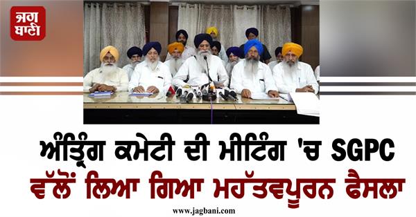 ਅੰਮ੍ਰਿਤਸਰ- ਸ਼੍ਰੋਮਣੀ ਗੁਰਦੁਆਰਾ ਪ੍ਰਬੰਧਕ ਕਮੇਟੀ ਦੀ ਅੰਤ੍ਰਿੰਗ ਕਮੇਟੀ ਦੀ ਮੀਟਿੰਗ ਹੋਈ। ਮੀਟਿੰਗ ਦੀ ਪ੍ਰਧਾਨਗੀ ਸ਼੍ਰੋਮਣੀ ਗੁਰਦੁਆਰਾ ਪ੍ਰਬੰਧਕ ਕਮੇਟੀ ਦੇ ਪ੍ਰਧਾਨ ਐਡਵੋਕੇਟ ਹਰਜਿੰਦਰ ਸਿੰਘ ਧਾਮੀ ਵੱਲੋਂ ਕੀਤੀ ਗਈ। ਪ੍ਰਧਾਨ ਧਾਮੀ ਨੇ ਕਿਹਾ ਕਿ ਸ੍ਰੀ ਅਕਾਲ ਤਖਤ ਸਾਹਿਬ ਦੇ ਜਥੇਦਾਰ ਸਬੰਧੀ ਸੇਵਾ ਨਿਯਮ, ਨਿਯੁਕਤੀ ਤੇ ਸੇਵਾ ਮੁਕਤੀ ਨੂੰ ਲੈ ਕੇ ਸਬ ਕਮੇਟੀ ਗਠਤ ਕੀਤੀ ਜਾਵੇਗੀ, ਜੋ ਇਸ ਸਬੰਧੀ ਆਪਣੀ ਰਾਏ ਸ਼੍ਰੋਮਣੀ ਕਮੇਟੀ ਨੂੰ ਦੇਵੇਗੀ।