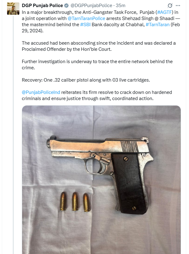 ਤਰਨਤਾਰਨ- ਇਕ ਵੱਡੀ ਸਫਲਤਾ ਵਿਚ ਐਂਟੀ-ਗੈਂਗਸਟਰ ਟਾਸਕ ਫੋਰਸ ਪੰਜਾਬ ਨੇ ਤਰਨਤਾਰਨ ਪੁਲਸ ਨਾਲ ਸਾਂਝੇ ਆਪ੍ਰੇਸ਼ਨ ਵਿੱਚ ਸ਼ਹਿਜ਼ਾਦ ਸਿੰਘ ਉਰਫ਼ ਸ਼ਾਦੀ ਨੂੰ ਗ੍ਰਿਫ਼ਤਾਰ ਕਰ ਲਿਆ ਹੈ। ਜੋ ਕਿ (ਝਬਾਲ) ਤਰਨਤਾਰਨ, (29 ਫਰਵਰੀ, 2024) ਵਿਖੇ ਐੱਸ. ਬੀ.ਆਈ. ਬੈਂਕ ਡਕੈਤੀ ਦਾ ਮਾਸਟਰਮਾਈਂਡ ਹੈ। ਇਸ ਦੀ ਜਾਣਕਾਰੀ ਪੰਜਾਬ ਦੇ ਡੀ. ਜੀ. ਪੀ. ਗੌਰਵ ਯਾਦਵ ਨੇ ਟਵੀਟ ਕਰ ਸਾਂਝੀ ਕੀਤੀ ਹੈ।