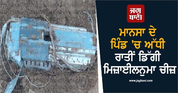 ਬੋਹਾ, ਬੁਢਲਾਡਾ (ਅਮਨਦੀਪ, ਬਾਂਸਲ) : ਜ਼ਿਲ੍ਹਾ ਮਾਨਸਾ ਦੇ ਪਿੰਡ ਮੱਲ ਸਿੰਘ ਵਾਲਾ 'ਚ ਅੱਧੀ ਰਾਤ ਮਿਜ਼ਾਈਲ ਨੁਮਾ ਚੀਜ਼ ਡਿੱਗੀ, ਜਿਸ ਨੇ ਖੇਤਾਂ 'ਚ ਤਬਾਹੀ ਮਚਾ ਦਿੱਤੀ। ਇਹ ਮਿਜ਼ਾਈਲ ਨੁਮਾ ਚੀਜ਼ ਡਿੱਗਣ ਨਾਲ ਵੱਡਾ ਧਮਾਕਾ ਹੋਇਆ, ਜਿਸ ਨੂੰ ਲੈ ਕੇ ਸਾਰਾ ਪਿੰਡ ਜਾਗ ਉੱਠਿਆ। ਜਿੱਥੇ ਇਹ ਚੀਜ਼ ਡਿੱਗੀ, ਉੱਥੇ ਪਈ ਤੂੜੀ ਨੂੰ ਅੱਗ ਲੱਗ ਗਈ ਅਤੇ ਡੂੰਘਾ ਟੋਇਆ ਪੁੱਟਿਆ ਗਿਆ। ਹੋਰ ਕਿਸੇ ਤਰ੍ਹਾਂ ਦੇ ਜਾਨੀ-ਮਾਲੀ ਨੁਕਸਾਨ ਦੀ ਖ਼ਬਰ ਨਹੀਂ ਹੈ।