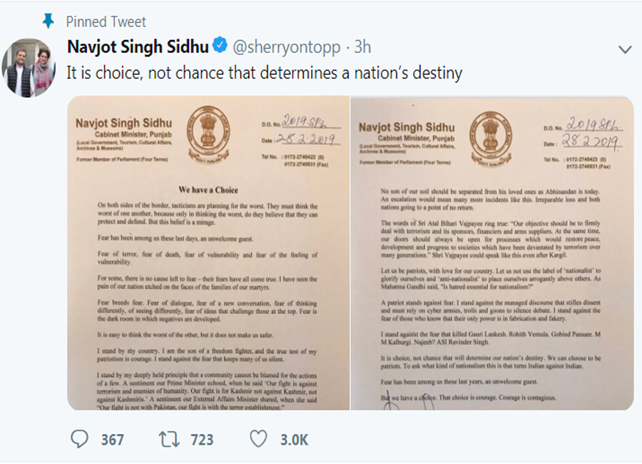 ਸਿੱਧੂ ਨੇ ਟਵਿੱਟਰ ਜ਼ਰੀਏ ਜੰਗ ਦੀ ਖਿਲਾਫਤ ਕਰਦੇ ਹੋਏ ਖੁੱਲ੍ਹੀ ਚਿੱਠੀ ਜਾਰੀ ਕਰਦੇ ਕਿਹਾ ਕਿ ਜੰਗ ਹੋਣਾ ਸਾਡੀ ਇੱਛਾ 'ਤੇ ਨਿਰਭਰ ਕਰਦਾ ਹੈ ਨਾ ਕਿ ਹਾਲਾਤ 'ਤੇ। ਇਸ ਤੋਂ ਇਲਾਵਾ ਅੱਗੇ ਲਿਖਦੇ ਹੋਏ ਨਵਜੋਤ ਸਿੰਘ ਸਿੱਧੂ ਨੇ ਕਿਹਾ ਕਿ ਅੱਤਵਾਦ ਦਾ ਹੱਲ ਸ਼ਾਂਤੀ ਅਤੇ ਵਿਕਾਸ ਹੈ ਨਾ ਕਿ ਬੇਰੋਜ਼ਗਾਰੀ, ਨਫਰਤ ਅਤੇ ਡਰ। ਉਨ੍ਹਾਂ ਨੇ ਕਿਹਾ ਕਿ ਉਹ ਆਪਣੇ ਦੇਸ਼ ਨਾਲ ਡਟੇ ਹੋਏ ਹਨ। ਇਸ ਦੇ ਨਾਲ ਹੀ ਉਨ੍ਹਾਂ ਨੇ ਆਪਣਾ ਪੁਰਾਣਾ ਵਿਵਾਦਿਤ ਬਿਆਨ ਵੀ ਦੋਹਰਾਉਂਦੇ ਕਿਹਾ ਕਿ ਕੁਝ ਲੋਕਾਂ ਦੇ ਕਾਰੇ ਕਾਰਨ ਪੂਰੀ ਕੌਮ ਨੂੰ ਦੋਸ਼ੀ ਨਹੀਂ ਠਹਿਰਾਇਆ ਜਾਣਾ ਚਾਹੀਦਾ।