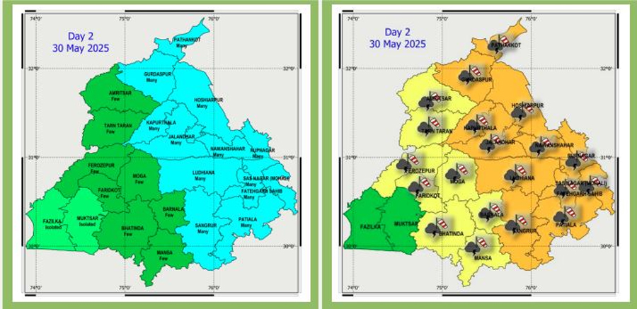 ਅੱਜ ਪੰਜਾਬ ਦੇ 20 ਜ਼ਿਲ੍ਹਿਆਂ ਵਿੱਚ ਅਲਰਟ ਜਾਰੀ ਕੀਤਾ ਗਿਆ ਹੈ। ਮੌਸਮ ਕੇਂਦਰ ਚੰਡੀਗੜ੍ਹ ਅਨੁਸਾਰ, ਪੰਜਾਬ ਦੇ 12 ਜ਼ਿਲ੍ਹਿਆਂ ‘ਚ ਸੰਤਰੀ ਅਲਰਟ ਜਾਰੀ ਕੀਤਾ ਗਿਆ ਹੈ। ਇਸ ਦੇ ਨਾਲ ਹੀ 8 ਜ਼ਿਲ੍ਹਿਆਂ ਵਿੱਚ ਪੀਲਾ ਅਲਰਟ ਜਾਰੀ ਕੀਤਾ ਗਿਆ ਹੈ। ਵਿਭਾਗ ਵੱਲੋਂ ਅੱਜ ਪਠਾਨਕੋਟ, ਹੁਸ਼ਿਆਰਪੁਰ, ਗੁਰਦਾਸਪੁਰ, ਕਪੂਰਥਲਾ, ਜਲੰਧਰ, ਲੁਧਿਆਣਾ, ਸੰਗਰੂਰ ਨਵਾਂਸ਼ਹਿਰ, ਰੂਪਨਗਰ, ਐੱਸ. ਏ. ਐੱਸ. ਨਗਰ, ਫ਼ਤਹਿਗੜ੍ਹ ਸਾਹਿਬ ਅਤੇ ਪਟਿਆਲਾ ਲਈ ਔਰੇਂਜ ਅਲਰਟ ਵੀ ਜਾਰੀ ਕੀਤਾ ਹੈ। ਇਸੇ ਤਰ੍ਹਾਂ ਅੰਮ੍ਰਿਤਸਰ, ਤਰਨਤਾਰਨ, ਫਿਰੋਜ਼ਪੁਰ, ਮੋਗਾ, ਫਰੀਦਕੋਟ, ਬਠਿੰਡਾ, ਮਾਨਸਾ ਅਤੇ ਬਰਨਾਲਾ ਵਿਚ ਮੌਸਮ ਦਾ 'ਯੈਲੋ ਅਲਰਟ' ਜਾਰੀ ਕੀਤਾ ਗਿਆ ਹੈ।
