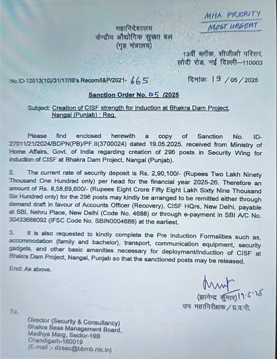 ਕੇਂਦਰ ਸਰਕਾਰ ਨੇ ਭਾਖੜਾ ਡੈਮ ਦੀ ਸੁਰੱਖਿਆ ਲਈ ਸੀਆਈਐੱਸਐੱਫ ਦੀਆਂ 296 ਅਸਾਮੀਆਂ ਨੂੰ ਮਨਜ਼ੂਰੀ ਦਿੱਤੀ ਸੀ। ਕੇਂਦਰ ਨੇ ਸੁਰੱਖਿਆ ਲਈ 8 ਕਰੋੜ 59 ਲੱਖ ਰੁਪਏ ਦੀ ਰਕਮ ਅਲਾਟ ਕੀਤੀ ਹੈ। ਇਸ ਦੇ ਨਾਲ ਹੀ, ਕੇਂਦਰ ਨੇ ਭਾਖੜਾ ਡੈਮ 'ਤੇ ਸੀਆਈਐੱਸਐੱਫ ਸੁਰੱਖਿਆ ਬਲਾਂ ਦੀ ਰਿਹਾਇਸ਼, ਸੰਚਾਰ ਅਤੇ ਆਵਾਜਾਈ ਅਤੇ ਹੋਰ ਜ਼ਰੂਰੀ ਸਹੂਲਤਾਂ ਦੇ ਪ੍ਰਬੰਧ ਕਰਨ ਦੇ ਨਿਰਦੇਸ਼ ਵੀ ਦਿੱਤੇ ਹਨ।