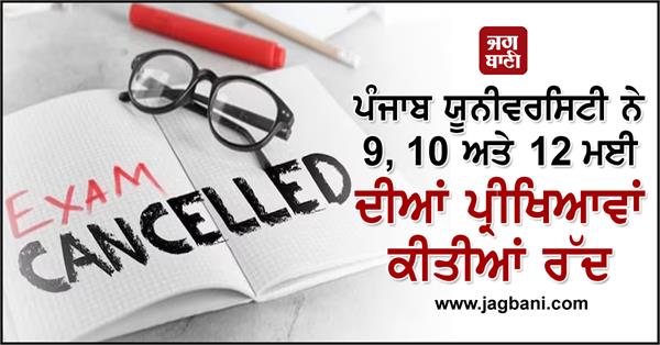 ਲੁਧਿਆਣਾ, (ਵਿੱਕੀ)- ਭਾਰਤ ਅਤੇ ਪਾਕਿਸਤਾਨ ਵਿਚਕਾਰ ਚੱਲ ਰਹੀ ਜੰਗ ਦੇ ਮੱਦੇਨਜ਼ਰ, ਪੰਜਾਬ ਯੂਨੀਵਰਸਿਟੀ ਚੰਡੀਗੜ੍ਹ ਨੇ 9, 10 ਅਤੇ 12 ਮਈ ਨੂੰ ਹੋਣ ਵਾਲੀਆਂ ਸਾਰੀਆਂ ਪ੍ਰੀਖਿਆਵਾਂ ਰੱਦ ਕਰਨ ਦਾ ਐਲਾਨ ਕੀਤਾ ਹੈ। ਇਹ ਜਾਣਕਾਰੀ ਯੂਨੀਵਰਸਿਟੀ ਪ੍ਰਸ਼ਾਸਨ ਨੇ ਇਕ ਸੋਸ਼ਲ ਮੀਡੀਆ ਪੋਸਟ ਰਾਹੀਂ ਸਾਂਝੀ ਕੀਤੀ।