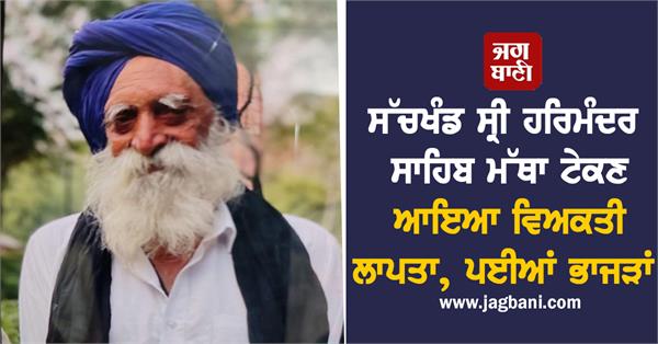 ਅੰਮ੍ਰਿਤਸਰ- ਸੱਚਖੰਡ ਸ੍ਰੀ ਹਰਿਮੰਦਰ ਸਾਹਿਬ ਦਰਸ਼ਨ ਲਈ ਆਇਆ 75 ਸਾਲਾ ਬਜ਼ੁਰਗ ਵਿਅਕਤੀ ਅੰਮ੍ਰਿਤਸਰ ਵਿੱਚ ਲਾਪਤਾ ਹੋ ਗਿਆ। ਲਾਪਤਾ ਵਿਅਕਤੀ ਦੀ ਪਛਾਣ ਦਰਸ਼ਨ ਸਿੰਘ ਵਜੋਂ ਹੋਈ ਹੈ ਜੋ ਜ਼ਿਲ੍ਹਾ ਸੰਗਰੂਰ ਦੇ ਹਲਕਾ ਸੁਨਾਮ ਦੇ ਪਿੰਡ ਲਖਮੀਰ ਬਾਲਾ ਦੇ ਰਹਿਣ ਵਾਲੇ ਹਨ। ਉਨ੍ਹਾਂ ਦੀ ਦਿਮਾਗੀ ਹਾਲਤ ਠੀਕ ਨਹੀਂ ਦੱਸੀ ਜਾ ਰਹੀ।