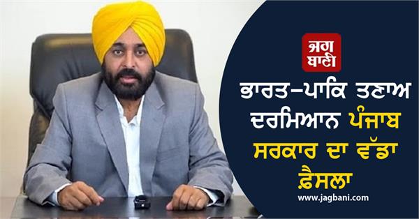 ਬੀਤੀ ਰਾਤ ਵੀ ਪੰਜਾਬ ਦੇ ਕਈ ਜ਼ਿਲ੍ਹਿਆਂ 'ਚ ਪਾਕਿਸਤਾਨ ਵਲੋਂ ਹਮਲੇ ਕੀਤੇ ਗਏ ਸਨ, ਜਿਨ੍ਹਾਂ ਨੂੰ ਕਾਮਯਾਬ ਨਹੀਂ ਹੋਣ ਦਿੱਤਾ ਗਿਆ। ਇਸ ਤਰ੍ਹਾਂ ਦੇ ਹਾਲਾਤ ਮਗਰੋਂ ਲੋਕਾਂ 'ਚ ਵੀ ਡਰ ਦਾ ਮਾਹੌਲ ਬਣਿਆ ਹੋਇਆ ਹੈ, ਜਿਸ ਦੇ ਚੱਲਦਿਆਂ ਪੰਜਾਬ ਸਰਕਾਰ ਵਲੋਂ ਇਹ ਵੱਡਾ ਫ਼ੈਸਲਾ ਲਿਆ ਗਿਆ ਹੈ।