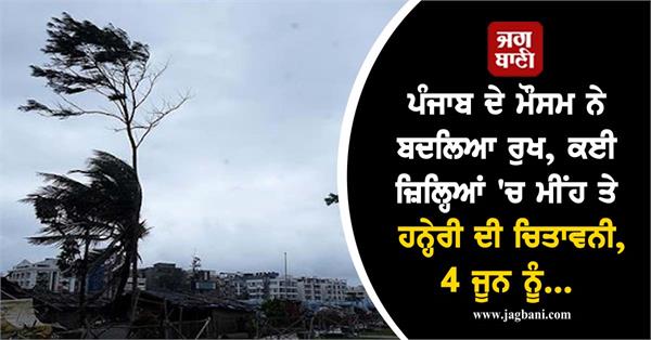 ਭਾਰਤੀ ਮੌਸਮ ਵਿਭਾਗ ਚੰਡੀਗੜ੍ਹ ਵਲੋਂ 2 ਜੂਨ ਯਾਨੀ ਅੱਜ ਪੰਜਾਬ ਦੇ ਕਈ ਜ਼ਿਲ੍ਹਿਆਂ 'ਚ ਮੀਂਹ ਪੈਣ ਦੀ ਚਿਤਾਵਨੀ ਜਾਰੀ ਕੀਤੀ ਗਈ ਹੈ। ਅੱਜ ਪੰਜਾਬ ਦੇ ਕਈ ਹਿੱਸਿਆਂ ਵਿਚ ਮੀਂਹ, ਬਿਜਲੀ ਚਮਕਣ ਅਤੇ 50-60 ਕਿ.ਮੀ. ਪ੍ਰਤੀ ਘੰਟਾ ਹਵਾ ਚੱਲਣ ਦੀ ਸੰਭਾਵਨਾ ਹੈ। ਖ਼ਾਸ ਕਰਕੇ ਪਟਿਆਲਾ, ਸੰਗਰੂਰ, ਬਰਨਾਲਾ, ਮਾਨਸਾ, ਬਠਿੰਡਾ, ਫਾਜ਼ਿਲਕਾ, ਫਿਰੋਜ਼ਪੁਰ, ਮੋਗਾ, ਲੁਧਿਆਣਾ, ਜਲੰਧਰ, ਨਵਾਂਸ਼ਹਿਰ, ਹੁਸ਼ਿਆਰਪੁਰ ਅਤੇ ਰੂਪਨਗਰ ਜ਼ਿਲ੍ਹਿਆਂ ਵਿੱਚ (ਸਾਵਧਾਨ ਰਹਿਣ) ਦੀ ਚੇਤਾਵਨੀ ਦਿੱਤੀ ਗਈ ਹੈ, ਕਿਉਂਕਿ ਇਨ੍ਹਾਂ ਜ਼ਿਲ੍ਹਿਆਂ ਵਿਚ ਬਾਰਿਸ਼ ਹੋਣ ਦੀ ਸੰਭਾਵਨਾ ਹੈ।