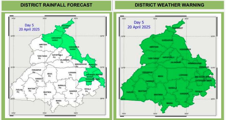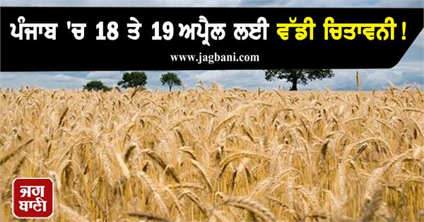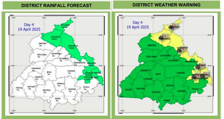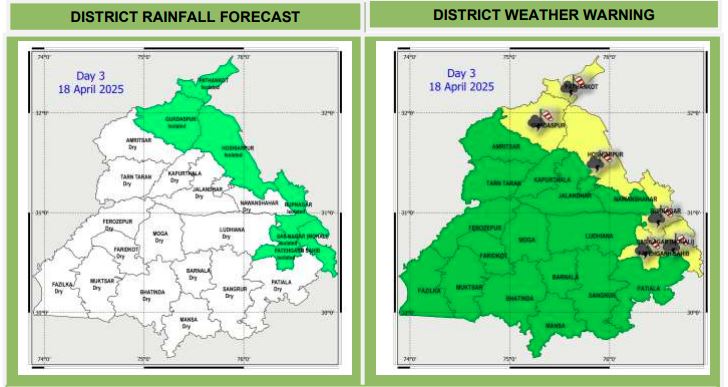 ਮੌਸਮ ਵਿਭਾਗ ਵੱਲੋਂ 18 ਅਤੇ 19 ਅਪ੍ਰੈਲ ਨੂੰ 6 ਜ਼ਿਲ੍ਹਿਆਂ ਲਈ ਯੈਲੋ ਅਲਰਟ ਜਾਰੀ ਕੀਤਾ ਗਿਆ ਹੈ। ਵਿਭਾਗ ਵੱਲੋਂ ਇਨ੍ਹਾਂ ਦੋ ਦਿਨਾਂ ਲਈ ਪਠਾਨਕੋਟ, ਹੁਸ਼ਿਆਰਪੁਰ, ਗੁਰਦਾਸਪੁਰ, ਰੂਪਨਗਰ, ਐੱਸ.ਏ.ਐੱਸ. ਨਗਰ ਅਤੇ ਫ਼ਤਹਿਗੜ੍ਹ ਸਾਹਿਬ ਲਈ ਯੈਲੋ ਅਲਰਟ ਜਾਰੀ ਕੀਤਾ ਗਿਆ ਹੈ। ਇਨ੍ਹਾਂ ਜ਼ਿਲ੍ਹਿਆਂ ਵਿਚ ਮੀਂਹ ਦੇ ਨਾਲ-ਨਾਲ ਤੇਜ਼ ਹਨੇਰੀ ਚੱਲੇਗੀ। ਇਸੇ ਤਰ੍ਹਾਂ 20 ਅਪ੍ਰੈਲ ਨੂੰ ਵੀ ਇਨ੍ਹਾਂ ਸਾਰੇ ਜ਼ਿਲ੍ਹਿਆਂ ਵਿਚ ਹੀ ਮੀਂਹ ਦਾ ਅਸਰ ਵੇਖਣ ਨੂੰ ਮਿਲੇਗਾ।