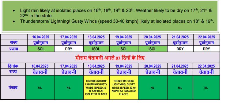 ਭਾਰਤੀ ਮੌਸਮ ਵਿਗਿਆਨ ਕੇਂਦਰ ਮੁਤਾਬਕ 18, 19 ਅਤੇ 20 ਅਪ੍ਰੈਲ ਨੂੰ ਸੂਬੇ ਵਿਚ ਕਈ ਥਾਵਾਂ 'ਤੇ ਬਾਰਿਸ਼ ਹੋ ਸਕਦੀ ਹੈ। ਵਿਭਾਗ ਨੇ 18 ਅਤੇ 19 ਅਪ੍ਰੈਲ ਨੂੰ ਸੂਬੇ ਵਿਚ ਮੀਂਹ ਦੇ ਨਾਲ-ਨਾਲ ਤੇਜ਼ ਹਨੇਰੀ ਚੱਲਣ ਦੀ ਵੀ ਭਵਿੱਖਬਾਣੀ ਕੀਤੀ ਹੈ। ਮੌਸਮ ਵਿਭਾਗ ਨੇ ਇਨ੍ਹਾਂ 2 ਦਿਨਾਂ ਲਈ ਸੂਬੇ ਵਿਚ ਕਈ ਥਾਵਾਂ 'ਤੇ ਯੈਲੋ ਅਲਰਟ ਜਾਰੀ ਕੀਤਾ ਹੈ। ਇਸ ਮਗਰੋਂ ਸੂਬੇ ਦੇ ਤਾਪਮਾਨ ਵਿਚ 2 ਤੋਂ 3 ਡਿਗਰੀ ਤਕ ਗਿਰਾਵਟ ਵੀ ਆਵੇਗੀ ਜਿਸ ਨਾਲ ਲੋਕਾਂ ਨੂੰ ਗਰਮੀ ਤੋਂ ਥੋੜ੍ਹੀ ਰਾਹਤ ਮਿਲੇਗੀ। ਫ਼ਿਲਹਾਲ ਸੂਬੇ ਵਿਚ ਲੂ ਬਾਰੇ ਕੋਈ ਅਲਰਟ ਨਹੀਂ ਹੈ।