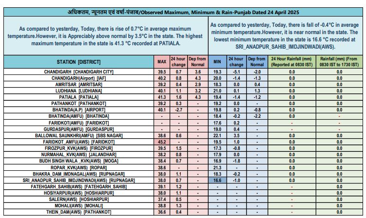 ਪਿਛਲੇ 24 ਘੰਟਿਆਂ ਵਿਚ ਤਾਪਮਾਨ ਵਿਚ 0.7 ਡਿਗਰੀ ਦਾ ਵਾਧਾ ਦਰਜ ਕੀਤਾ ਗਿਆ ਹੈ। ਇਸ ਵੇਲੇ ਸੂਬੇ ਦਾ ਤਾਪਮਾਨ ਆਮ ਨਾਲੋਂ 3.5 ਡਿਗਰੀ ਵੱਧ ਹੈ। ਫਰੀਦਕੋਟ ਵਿਚ ਸਭ ਤੋਂ ਵੱਧ ਤਾਪਮਾਨ 45.2 ਡਿਗਰੀ ਦਰਜ ਕੀਤਾ, ਜੋ ਸੂਬੇ ਭਰ ਵਿਚੋਂ ਸਭ ਤੋਂ ਜ਼ਿਆਦਾ ਸੀ।