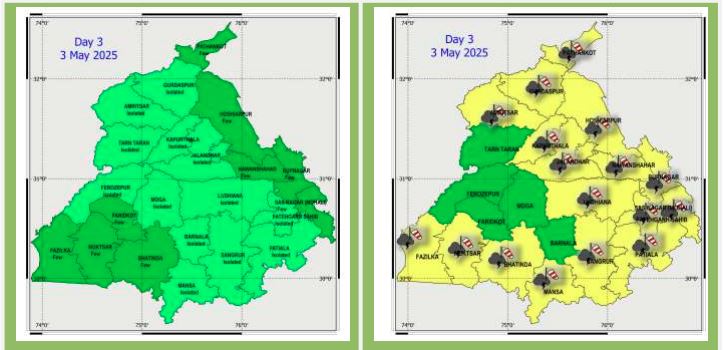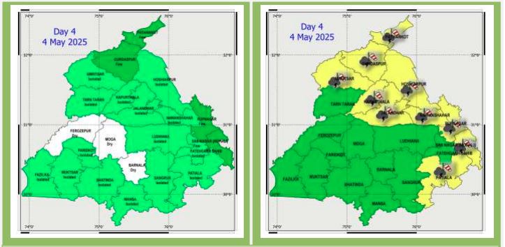 4 ਮਈ ਨੂੰ ਫਿਰੋਜ਼ਪੁਰ, ਮੋਗਾ ਤੇ ਬਰਨਾਲਾ ਤੋਂ ਇਲਾਵਾ ਬਾਕੀ ਸਾਰੇ ਜ਼ਿਲ੍ਹਿਆਂ ਵਿਚ ਬਾਰਿਸ਼ ਦੀ ਸੰਭਾਵਨਾ ਜਤਾਈ ਗਈ ਹੈ।