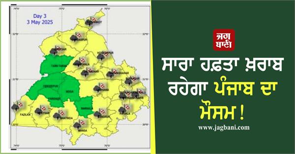 ਕੱਲ੍ਹ ਯਾਨੀ 3 ਮਈ ਨੂੰ ਵੀ ਸੂਬੇ ਭਰ ਵਿਚ ਬਾਰਿਸ਼ ਹੋਣ ਦੀ ਭਵਿੱਖਬਾਣੀ ਕੀਤੀ ਗਈ ਹੈ। ਇਸ ਦੇ ਨਾਲ ਹੀ ਮਾਝੇ ਤੇ ਮਾਲਵੇ ਦੇ 4-5 ਜ਼ਿਲ੍ਹਿਆਂ ਨੂੰ ਛੱਡ ਕੇ ਪੰਜਾਬ ਭਰ ਵਿਚ ਮੀਂਹ ਦੇ ਨਾਲ-ਨਾਲ ਹਨੇਰੀ ਦਾ ਵੀ ਯੈਲੋ ਅਲਰਟ ਜਾਰੀ ਕੀਤਾ ਗਿਆ ਹੈ।